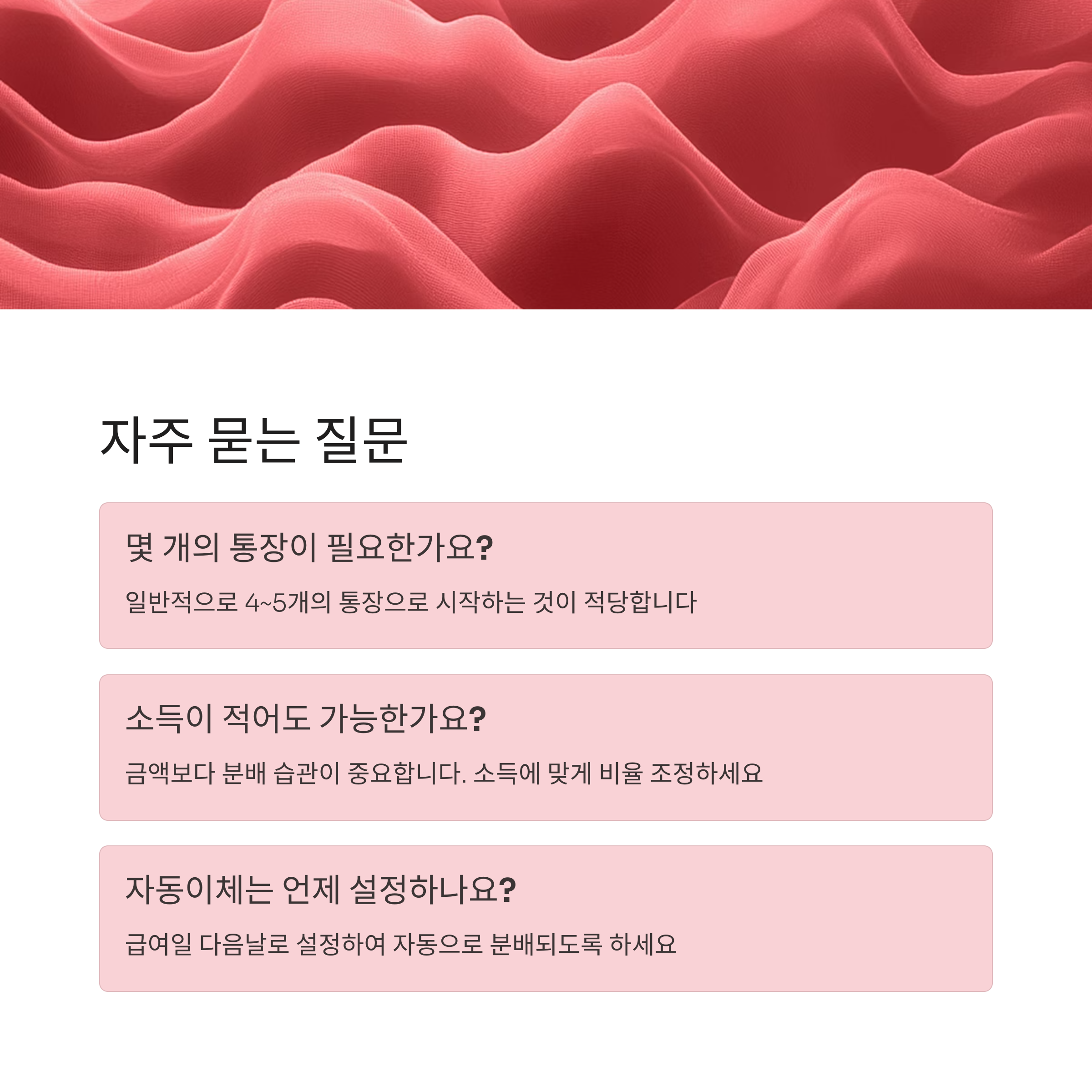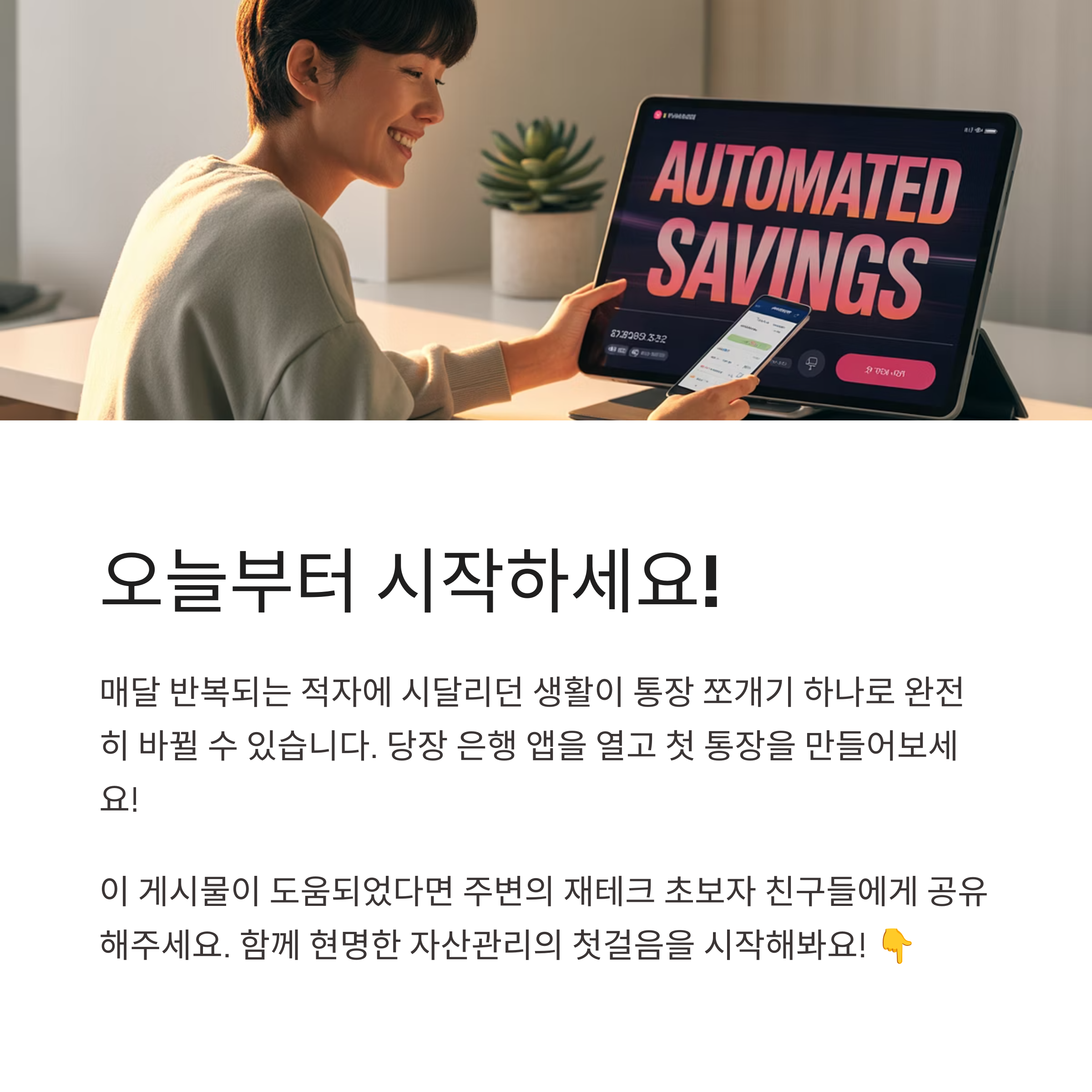 통장 쪼개기는 단순한 금융 습관이 아닙니다. 자기 통제력을 높이고 미래를 준비하는 강력한 재테크 전략입니다. 처음에는 번거로울 수 있지만, 몇 달만 실천해 보면 분명히 변화를 느낄 수 있습니다. 돈이 흘러가는 방향을 알게 되고, 저축과 소비 사이의 균형을 찾게 됩니다. 작은 실천이지만 그 효과는 커집니다. 오늘 바로 실행해 보시길 추천드립니다.