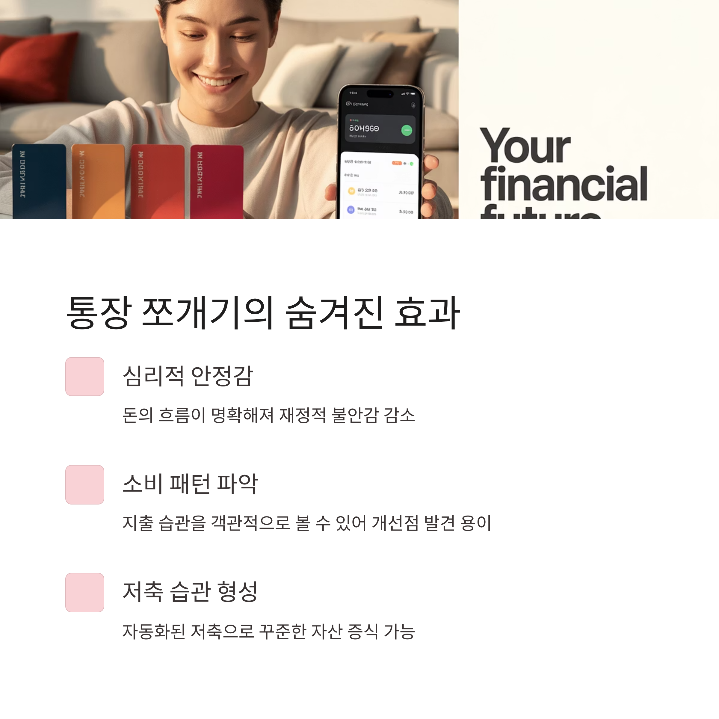통장 쪼개기의 핵심은 ‘보이지 않는 소비 차단’입니다. 돈을 눈에 보이게 나누어 놓으면 자신도 모르게 쓰는 돈이 줄어들고 ‘쓴 돈’, ‘남은 돈’, ‘쓸 수 있는 돈’이 명확해집니다. 이런 자각은 자연스럽게 소비 습관을 개선시키고 저축 습관을 길러주는 역할을 합니다. 또한 장기적으로는 투자 자산을 따로 관리함으로써 재산 증식에도 도움이 됩니다.