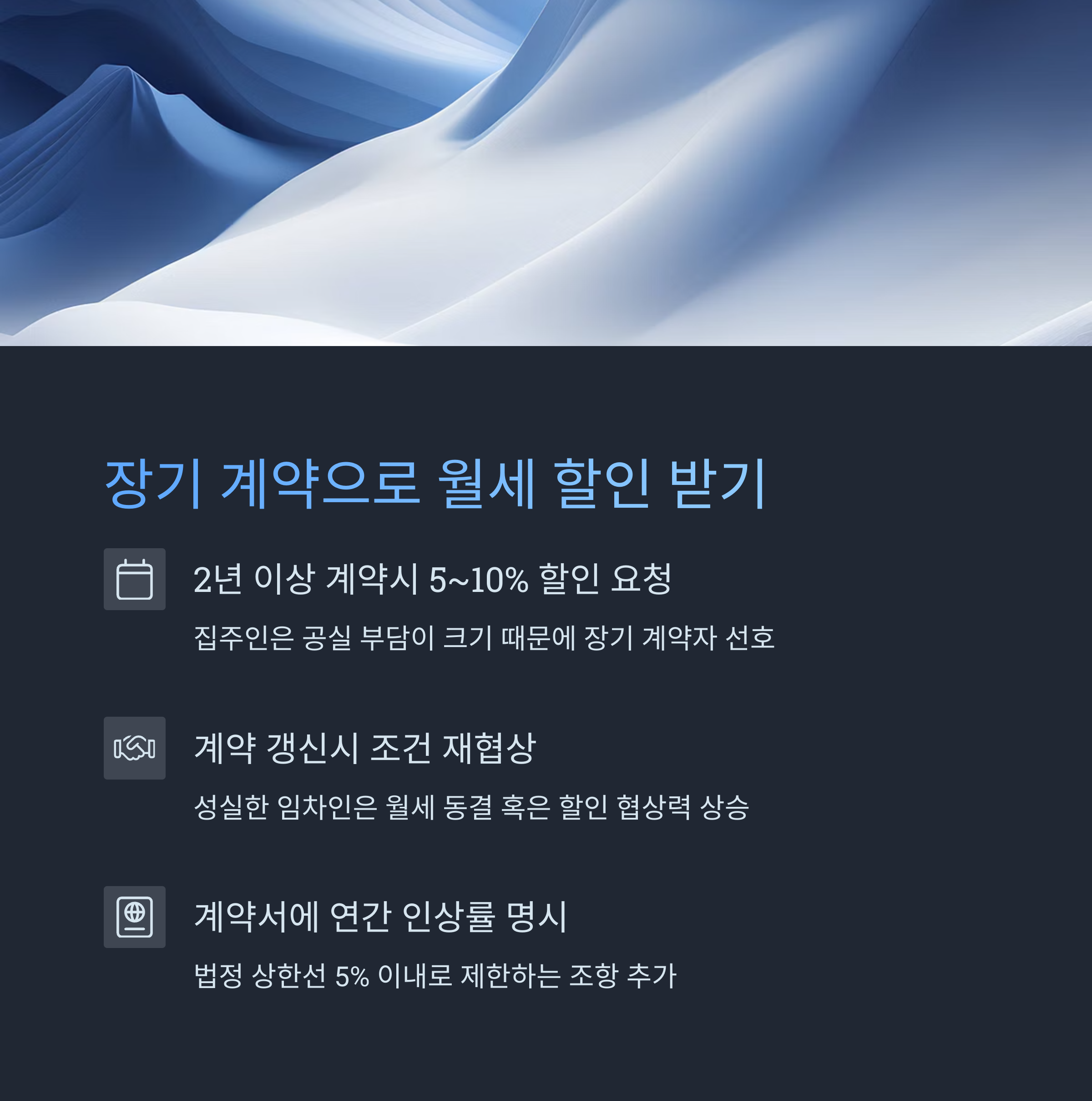 특히 2년 이상 장기 거주한 세입자라면 집주인 입장에서도 안정적인 임차인을 유지하고 싶어 하기 때문에 소폭의 월세 인하 요청은 충분히 수용될 수 있습니다.