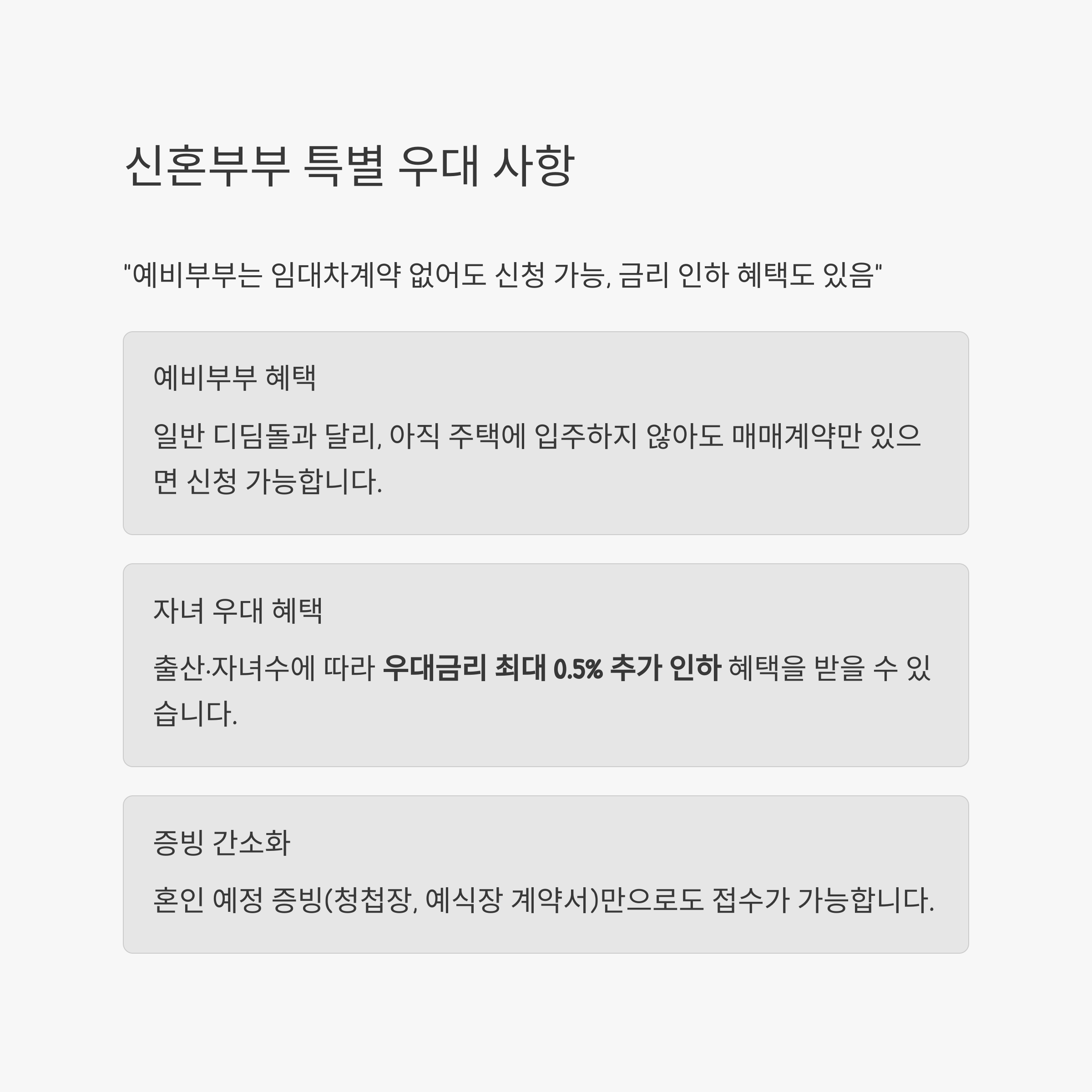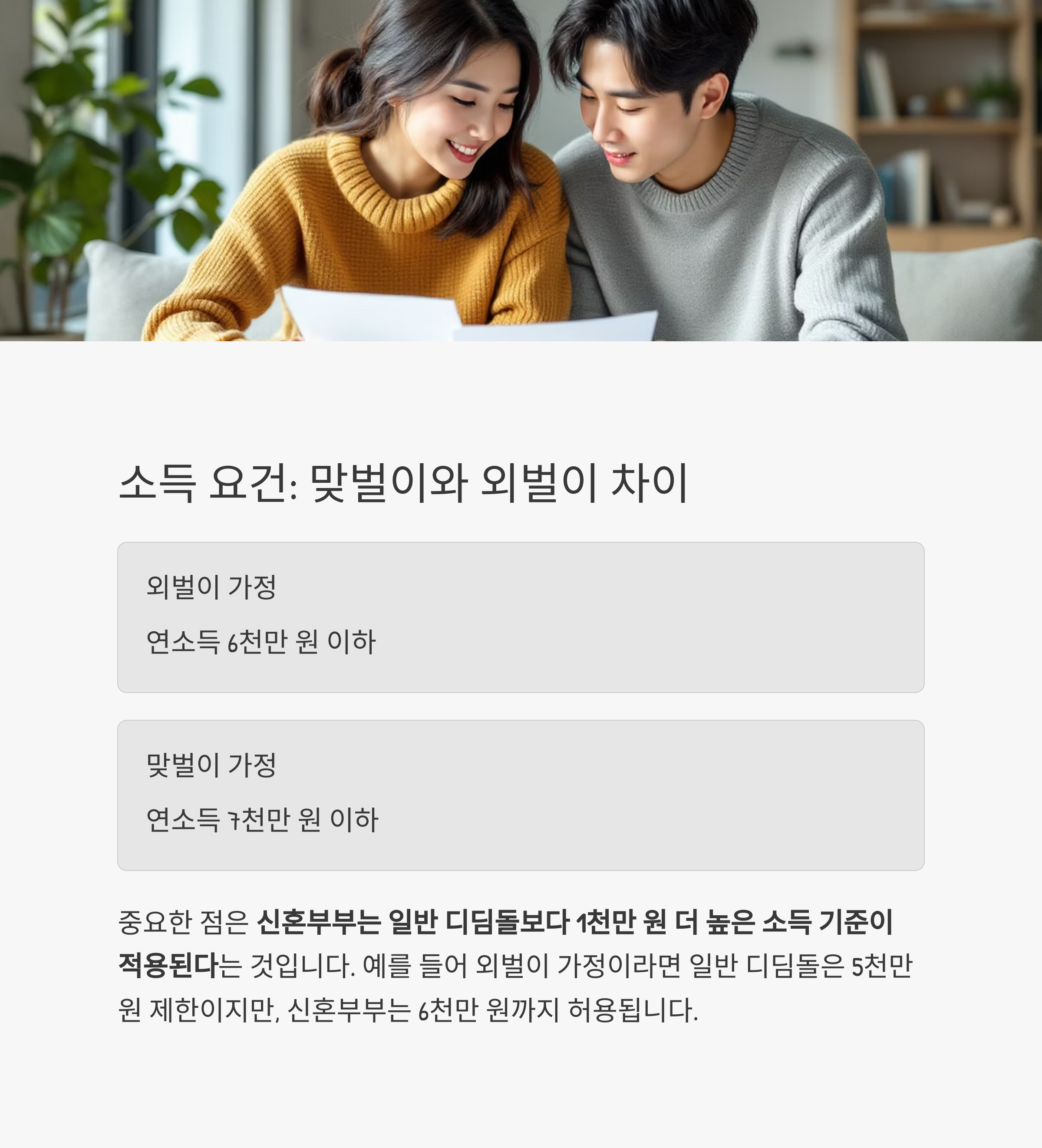 중요한 점은 "신혼부부는 일반 디딤돌보다 1천만 원 더 높은 소득 기준이 적용된다"는 것입니다.