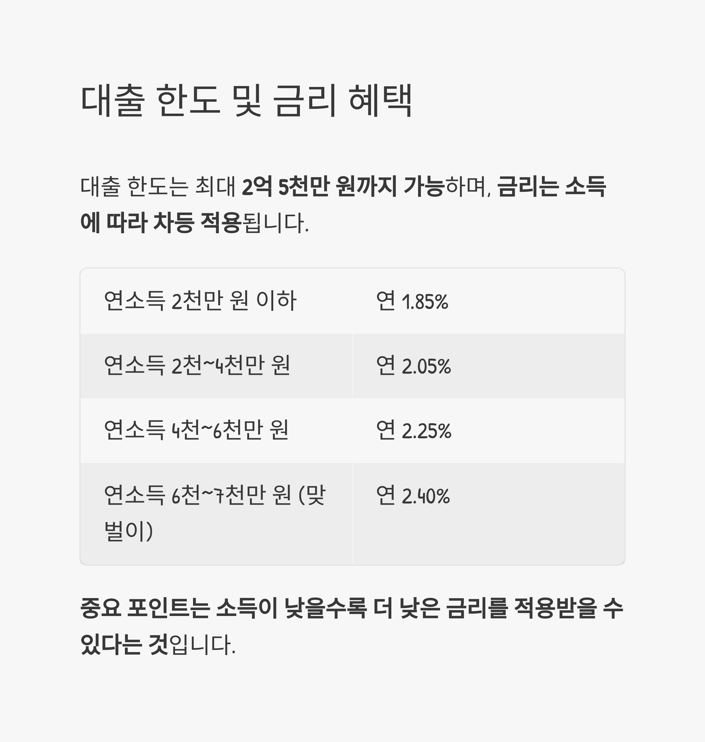대출 한도는 최대 2억 5천만 원까지 가능하며, 금리는 소득에 따라 차등 적용됩니다.
