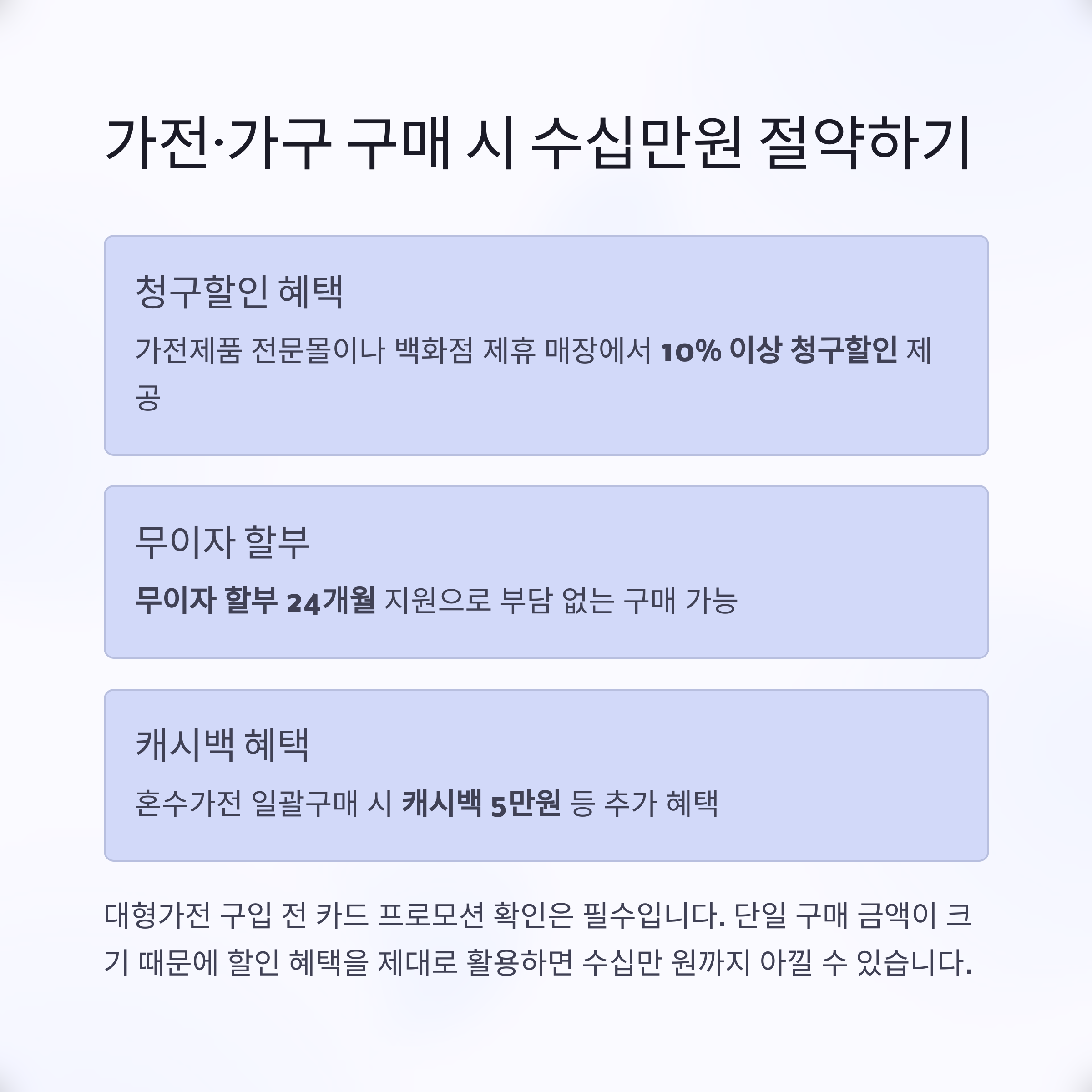 | B카드 | 12개월 무이자 + 캐시백 5만원 | 혼수가전 일괄구매 시 |