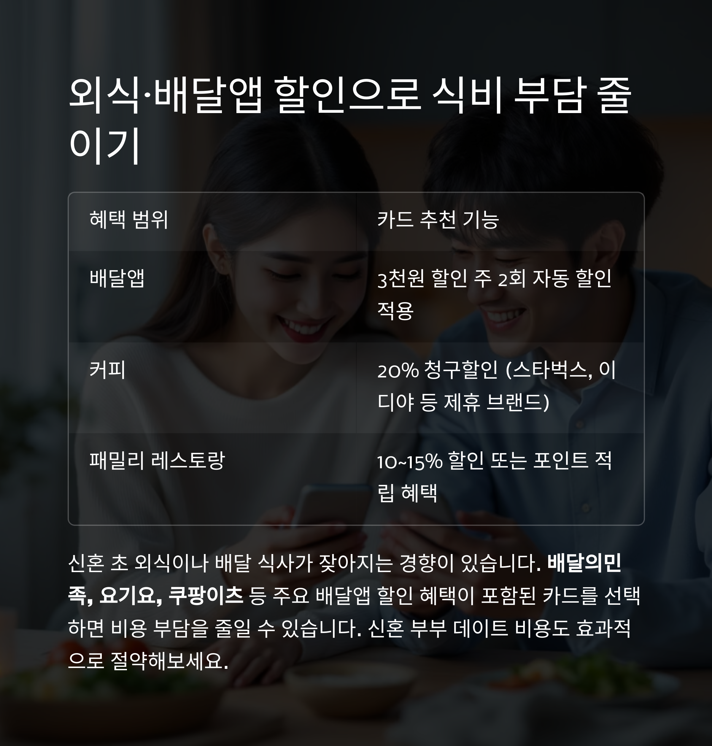 주요 배달앱 할인 혜택이 포함된 카드를 선택하면 비용 부담을 줄일 수 있습니다.