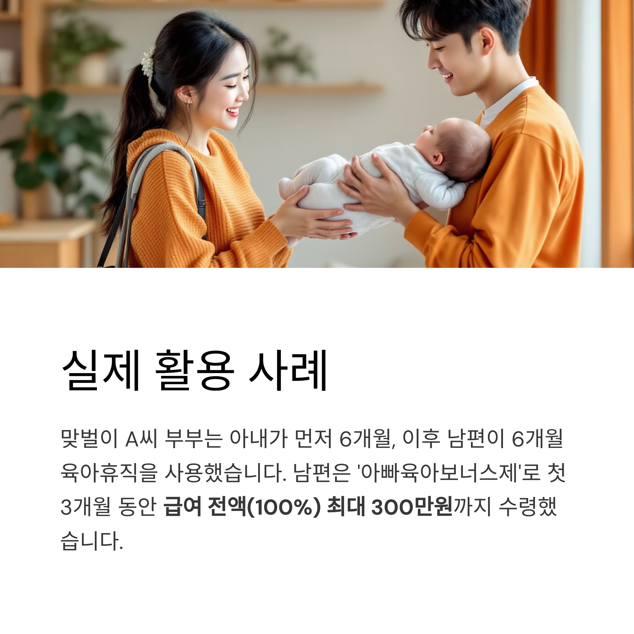 부부 모두 육아휴직 두 번째 사용자의 첫 3개월 급여 100% 최대 300만원
