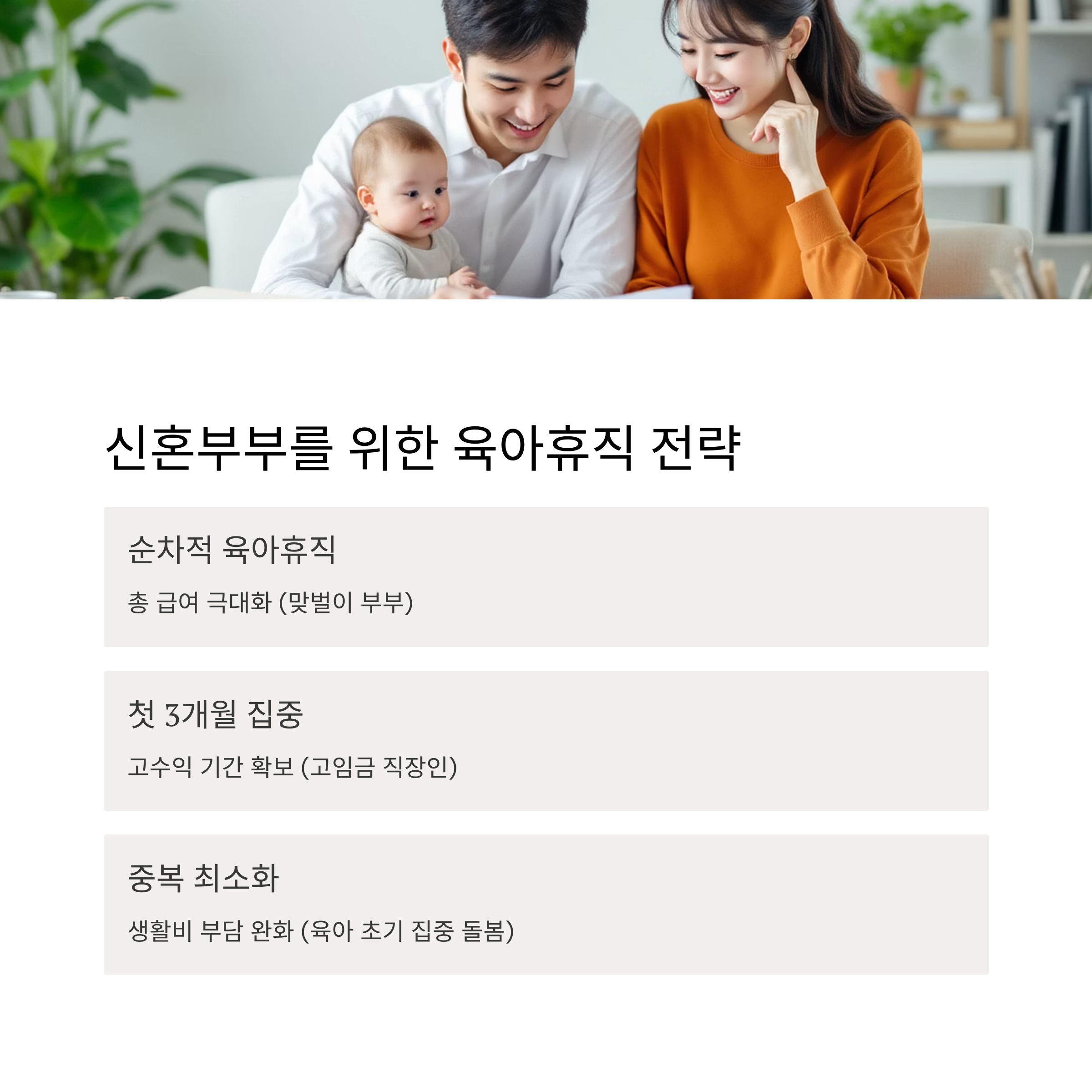 | 중복 기간 최소화 | 생활비 부담 완화 | 육아 초기 집중 돌봄 |