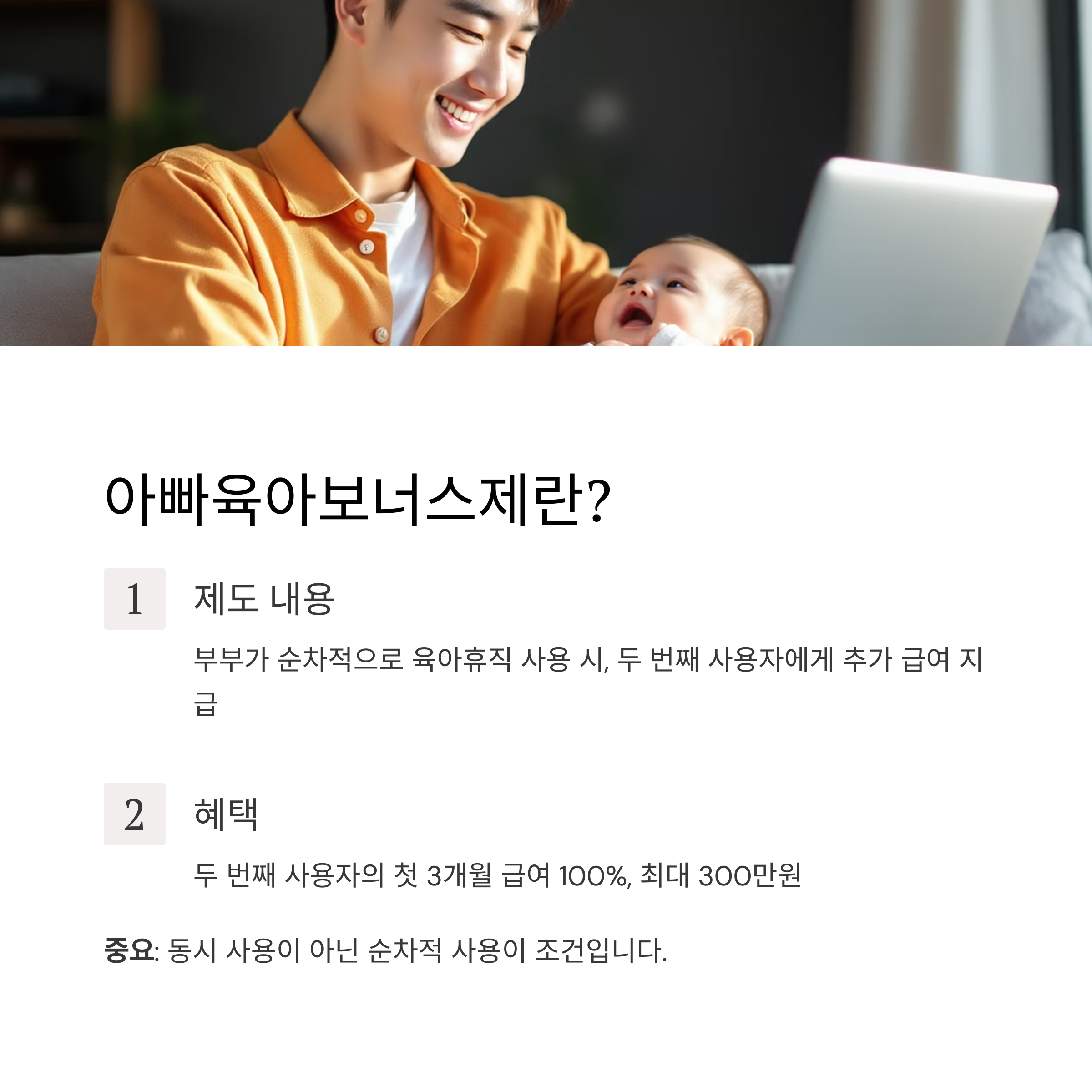 중요: 이 제도는 동시 육아휴직이 아니라 순차적 사용이 조건입니다.