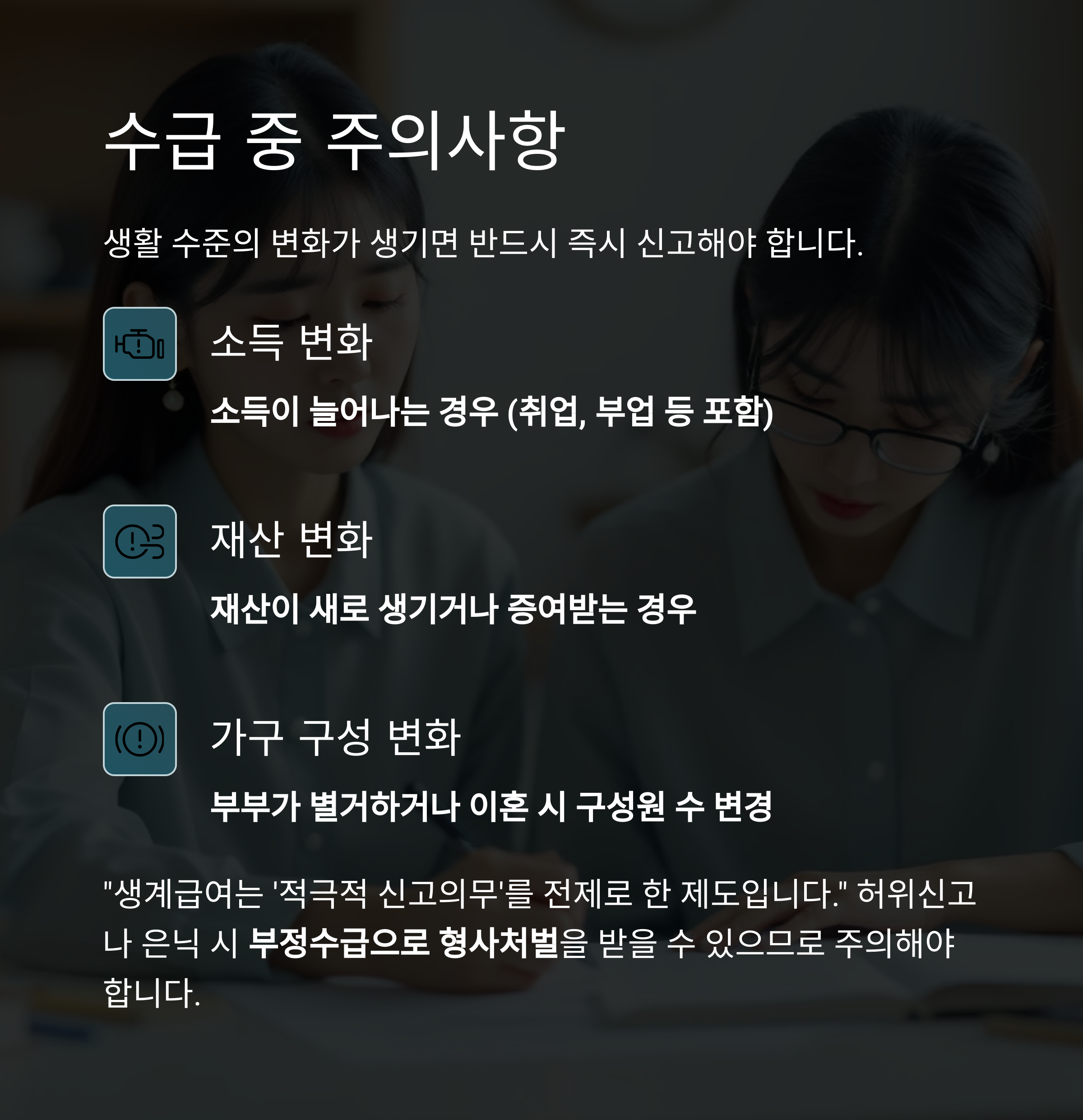 생활 수준의 변화가 생기면 반드시 즉시 신고해야 함