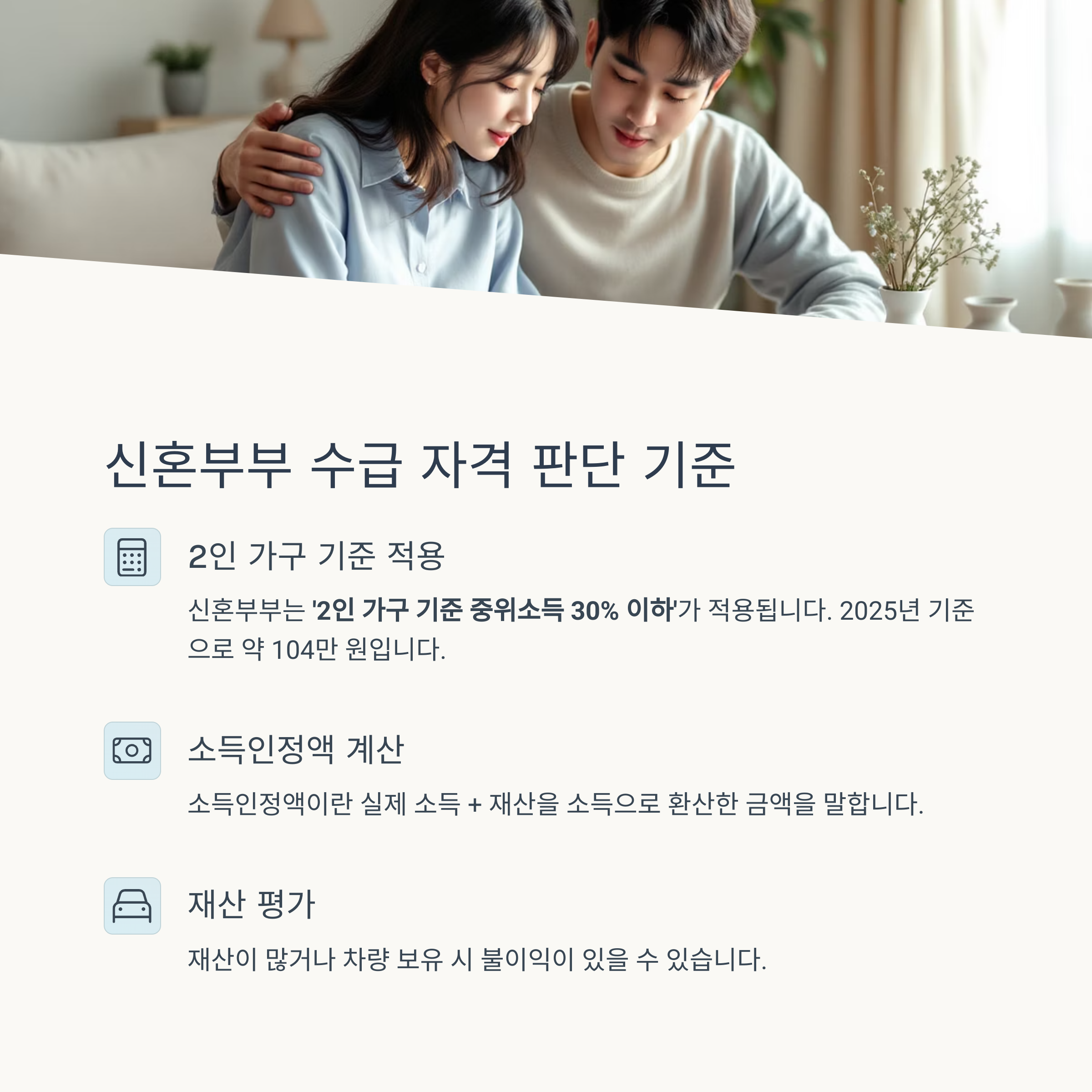 하지만 신혼부부라 해서 무조건 수급 자격이 되는 건 아니며, 소득인정액과 가구 특성에 따라 엄격한 기준을 적용받습니다.