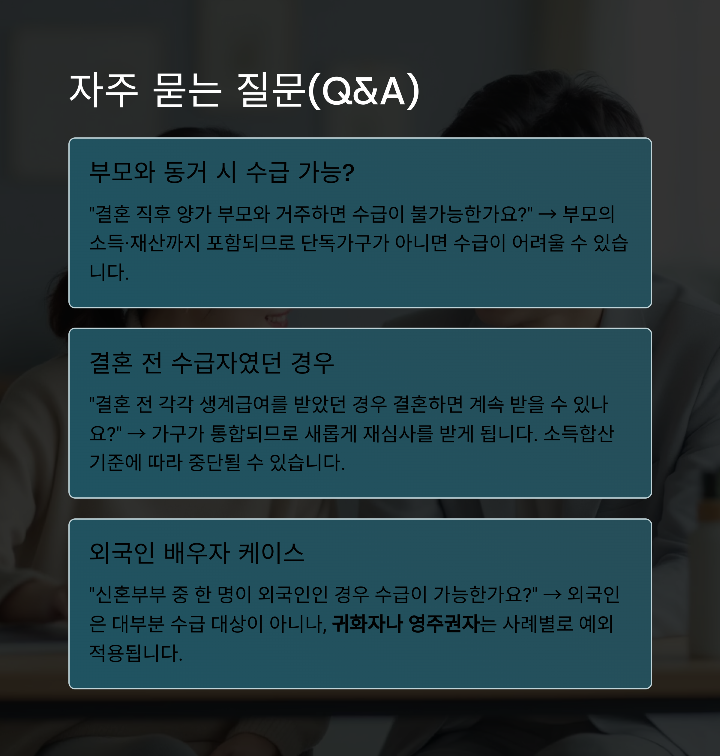 "결혼 직후 양가 부모와 거주하면 수급이 불가능한가요?"