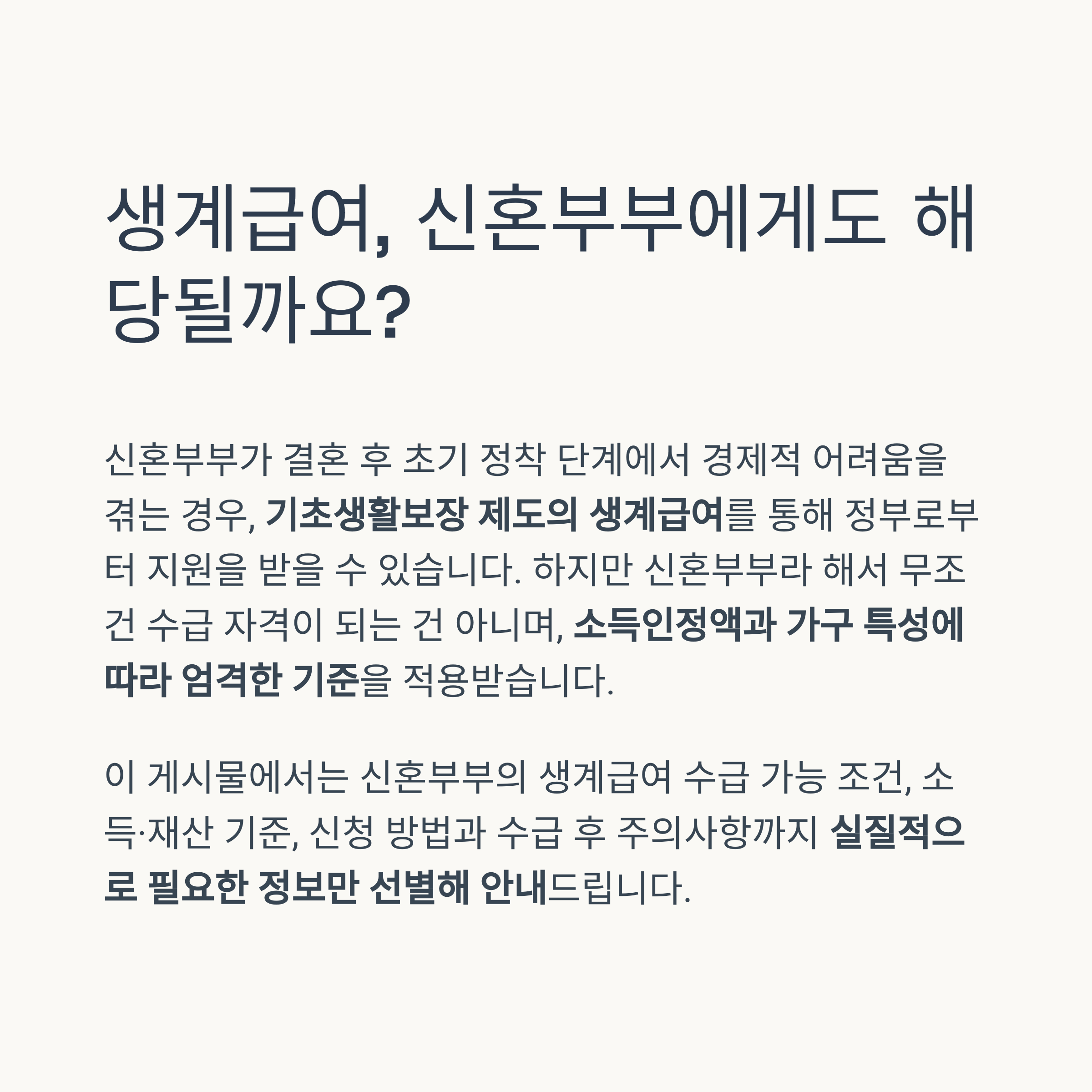 신혼부부가 생계급여를 신청할 경우 **‘2인 가구 기준 중위소득 30% 이하’**가 적용됩니다.