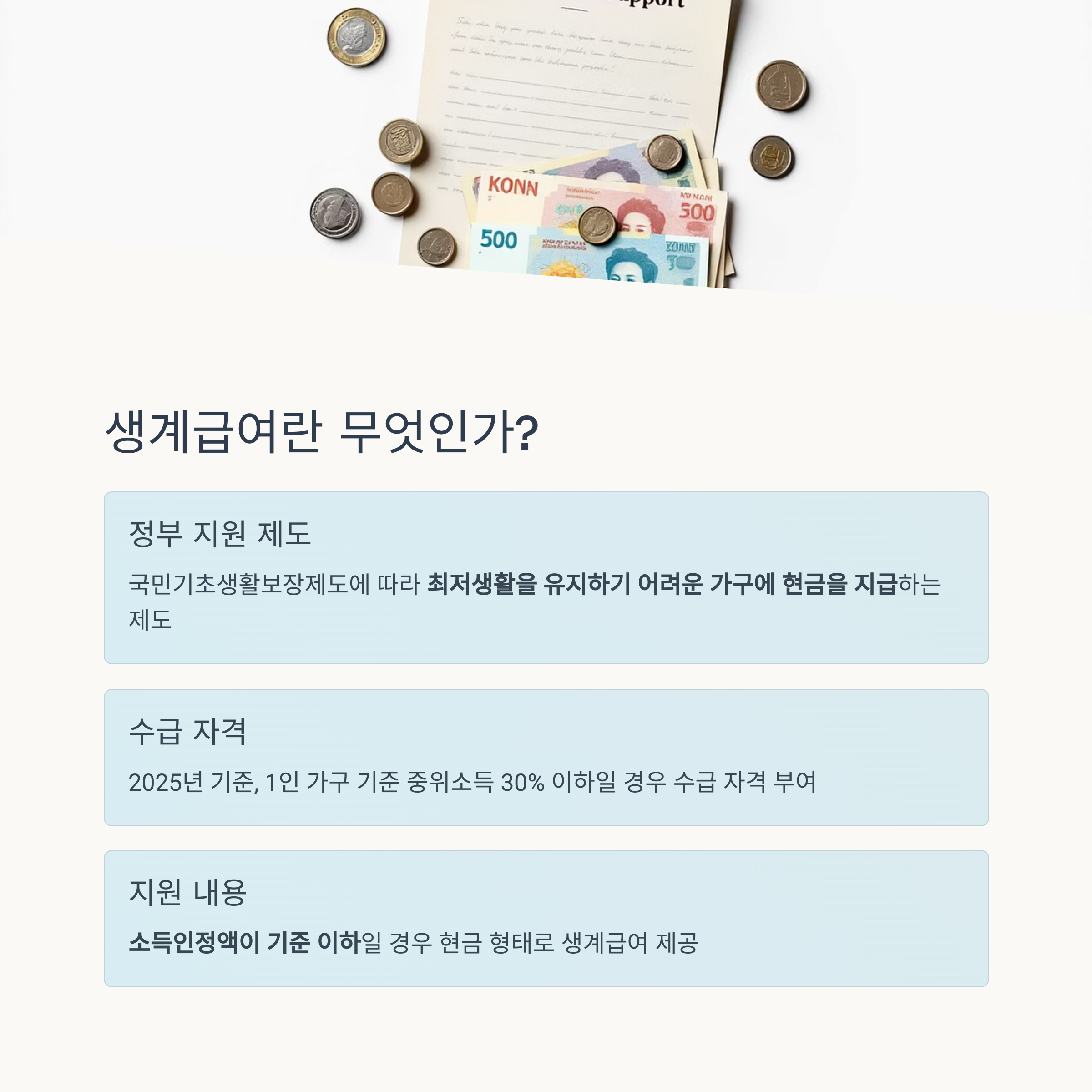 2025년 기준, 1인 가구 기준 중위소득 30% 이하일 경우 수급 자격이 주어지며, 소득인정액이 기준 이하일 경우 생계급여가 제공됩니다.