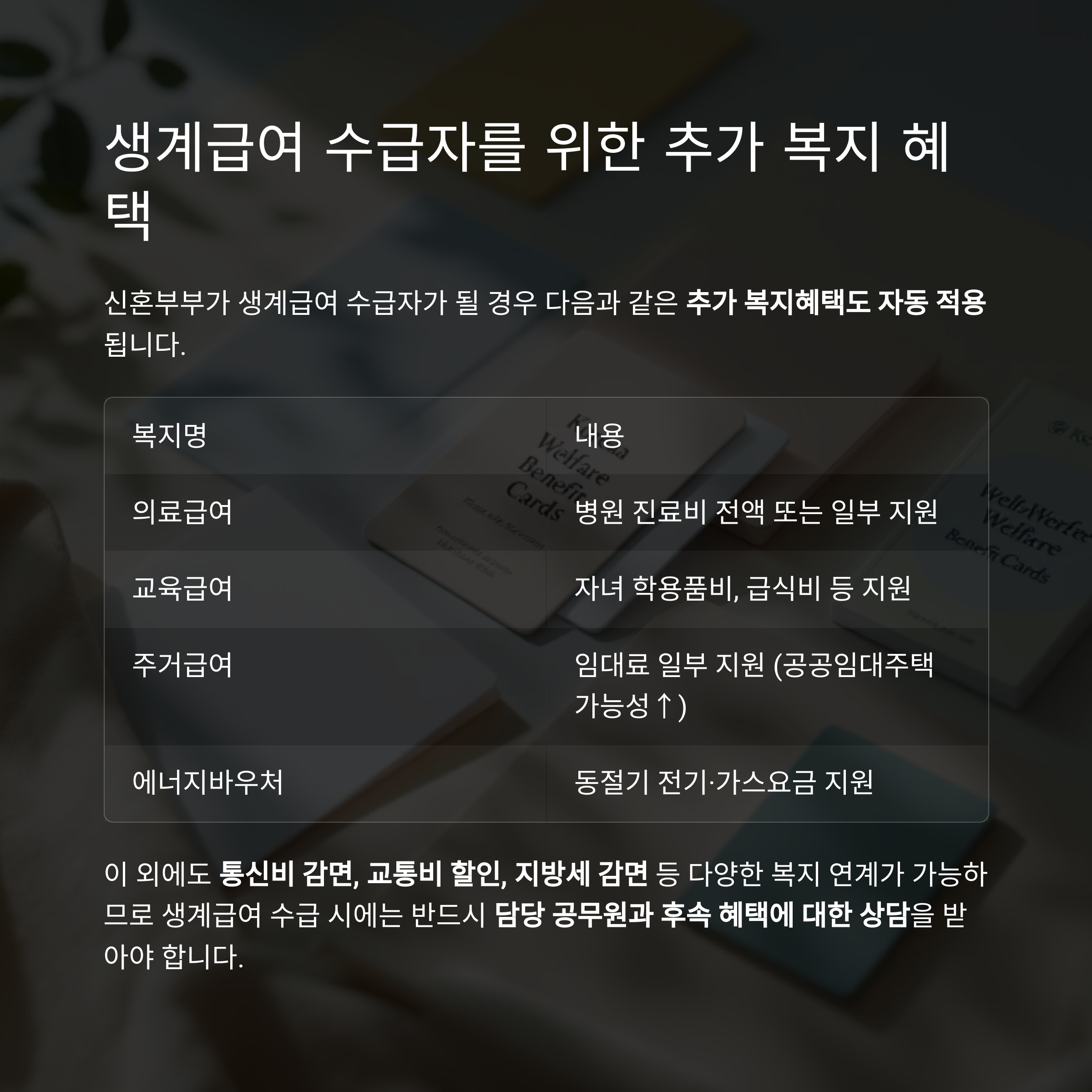 신혼부부가 생계급여 수급자가 될 경우 다음과 같은 추가 복지혜택도 자동 적용됩니다.