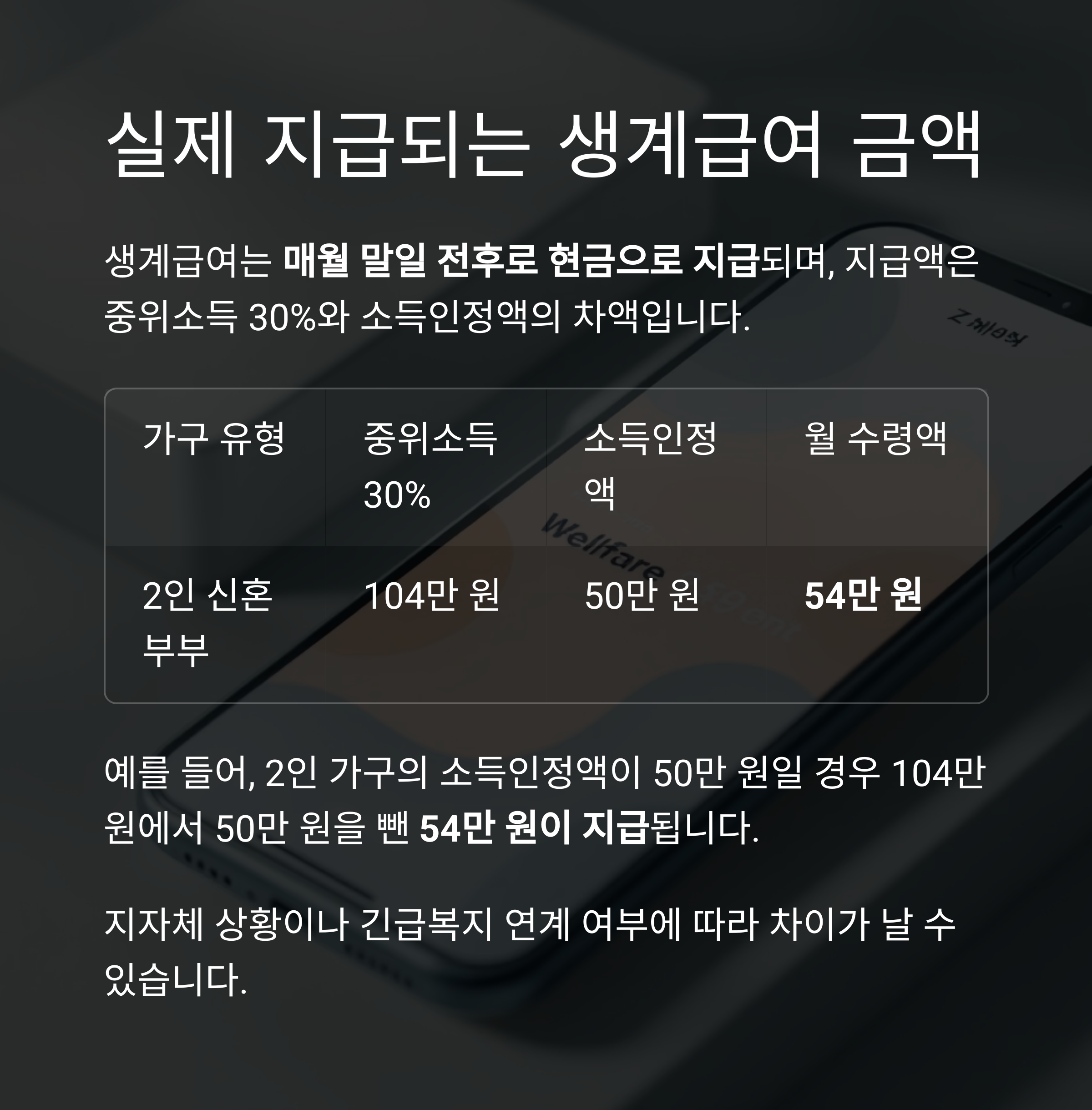 예를 들어, 2인 가구의 소득인정액이 50만 원일 경우 104만 원에서 50만 원을 뺀 54만 원이 지급됩니다.