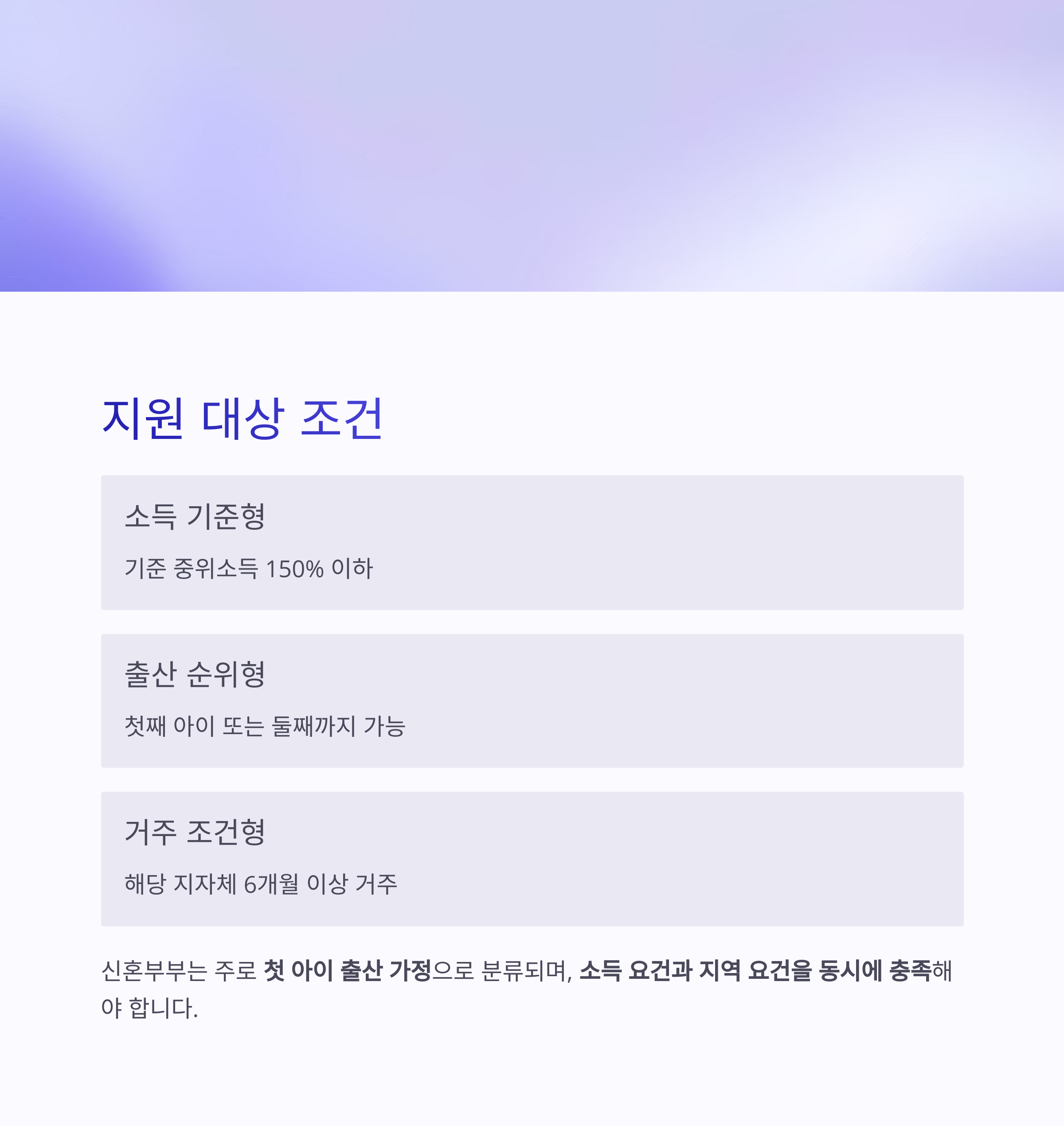 신혼부부는 주로 첫 아이 출산 가정으로 분류되며, 소득 요건과 지역 요건을 동시에 충족해야 지원이 가능합니다.