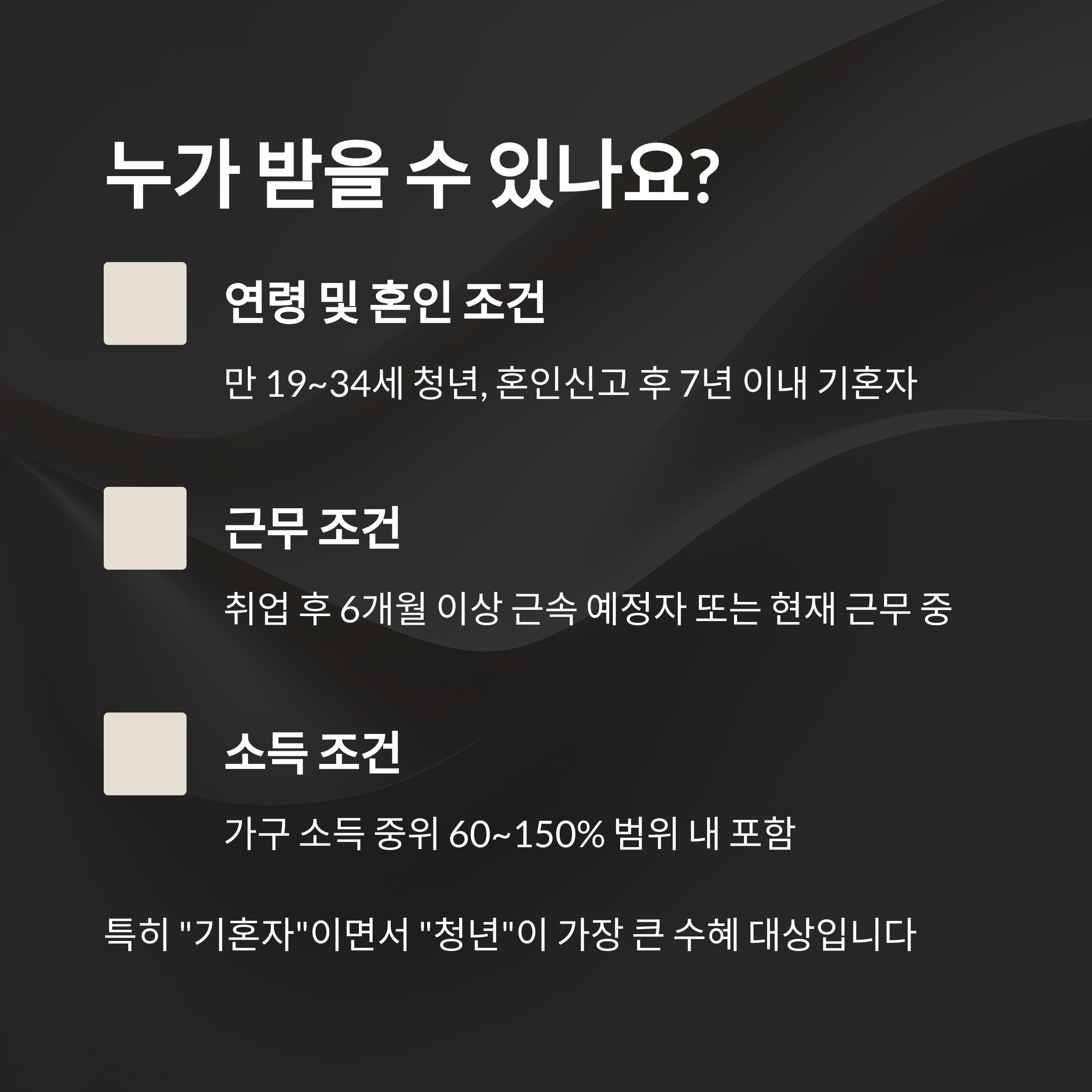 특히 “기혼자”이면서 “청년”에 해당하는 경우 가장 큰 수혜 대상으로 분류됩니다