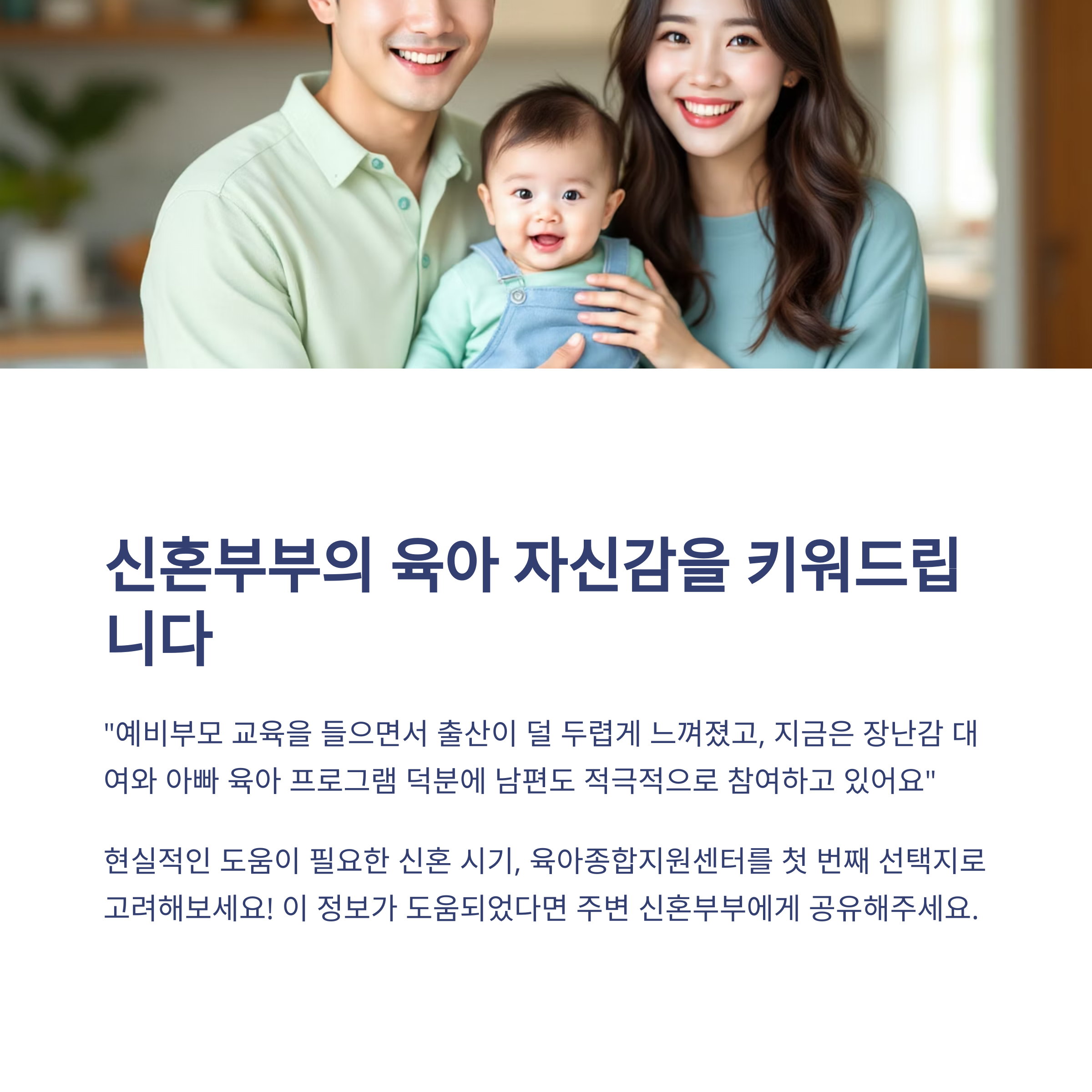 현실적인 도움이 절실한 신혼 시기, 육아종합지원센터는 그 첫 번째 선택지입니다.