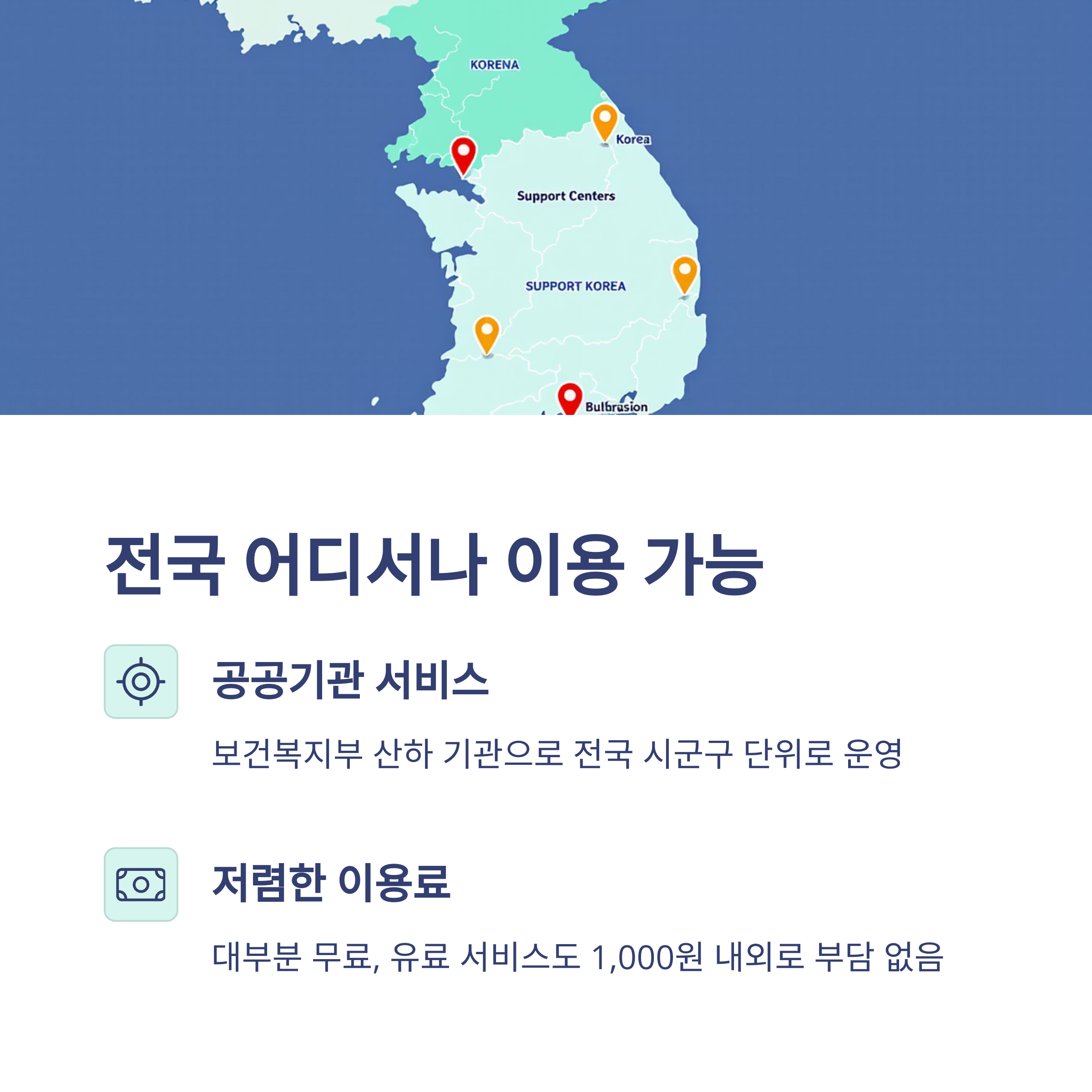 전국 시군구 단위로 운영되고 있어 주소지와 상관없이 가까운 센터를 이용할 수 있습니다.