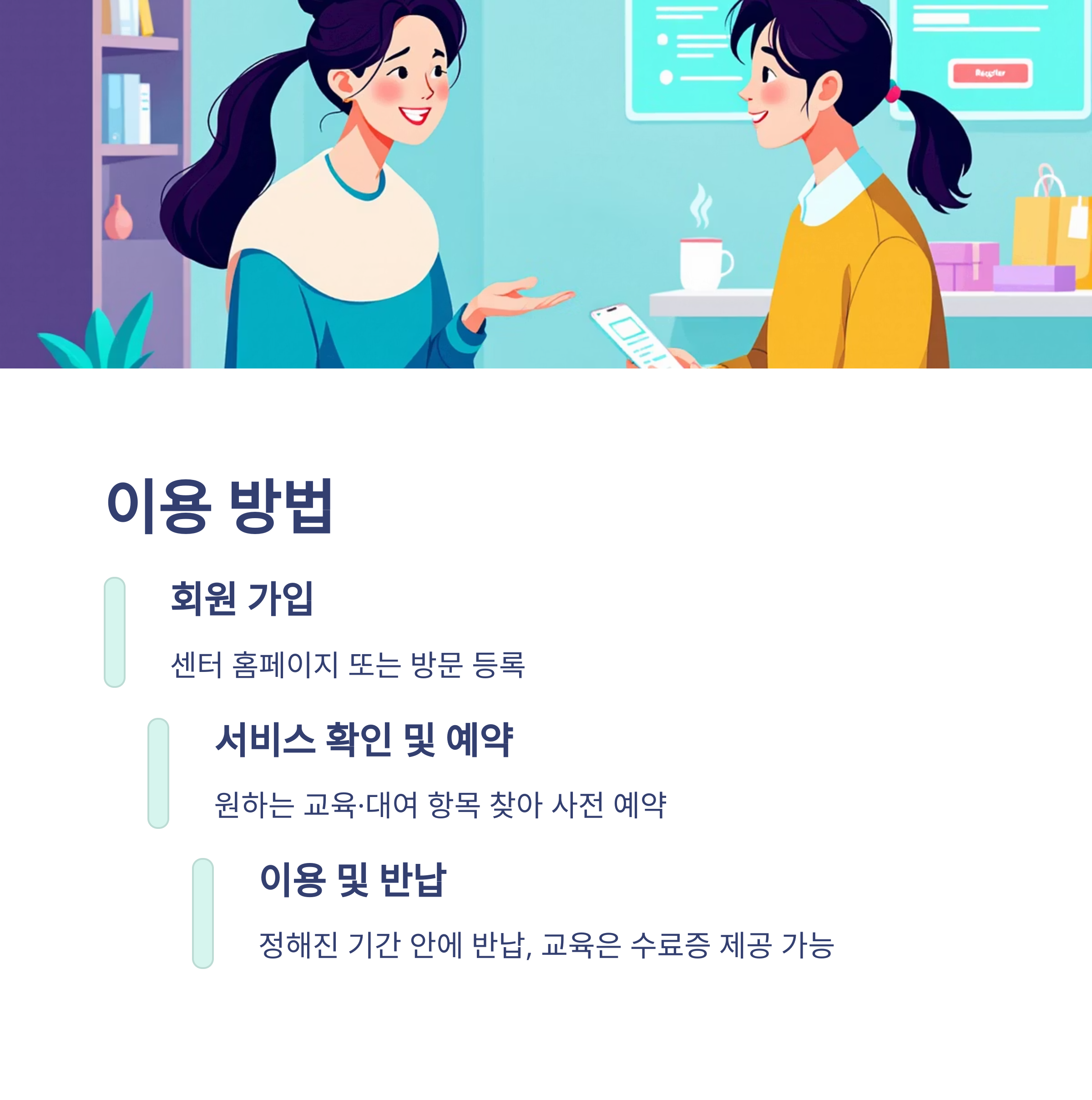 이용 및 반납 대여는 정해진 기간 안에 반납, 교육은 수료증 제공 가능
