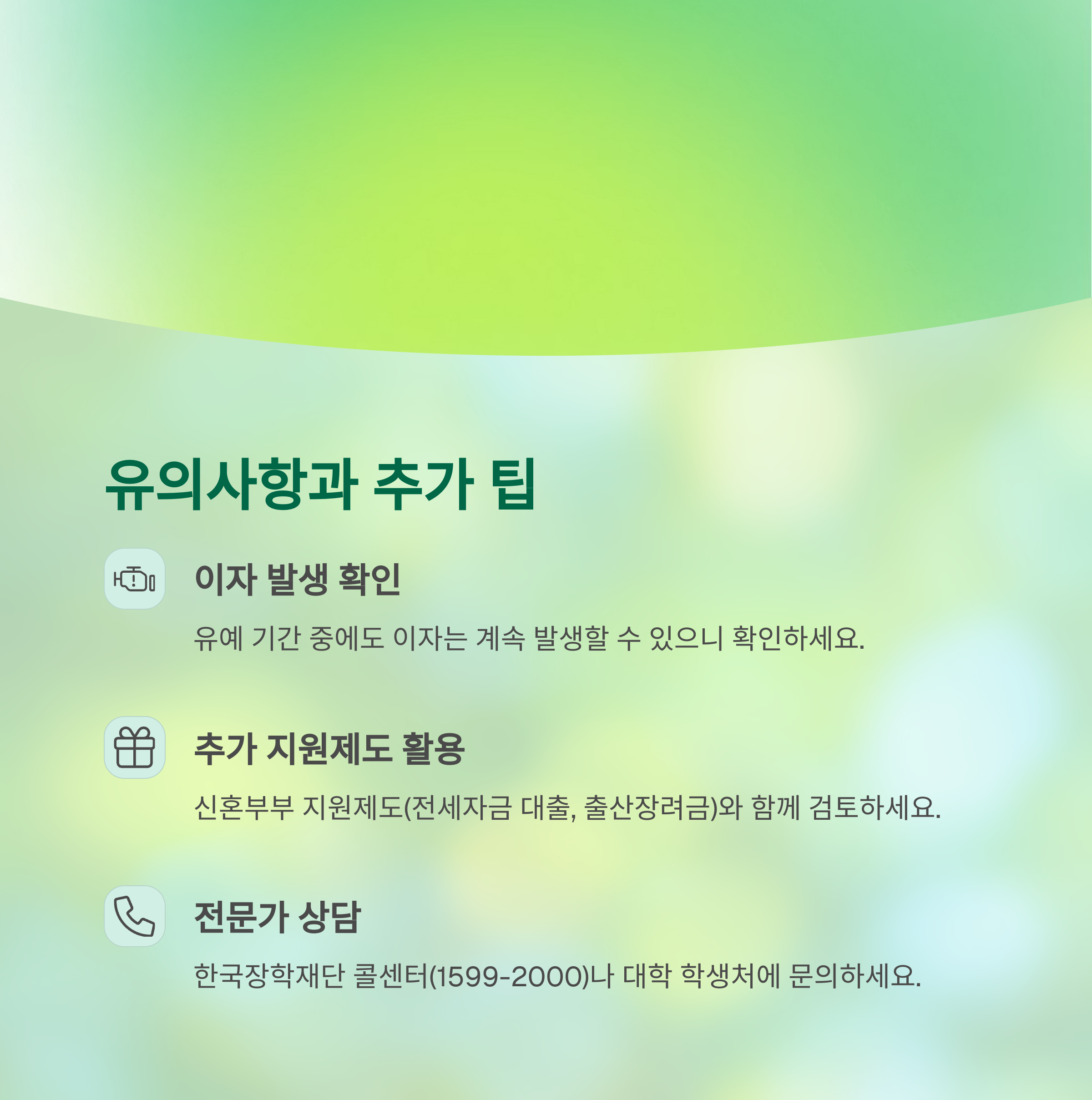 - 유예 기간 중에도 이자는 계속 발생할 수 있으므로 이자 면제 여부를 꼭 확인하세요
