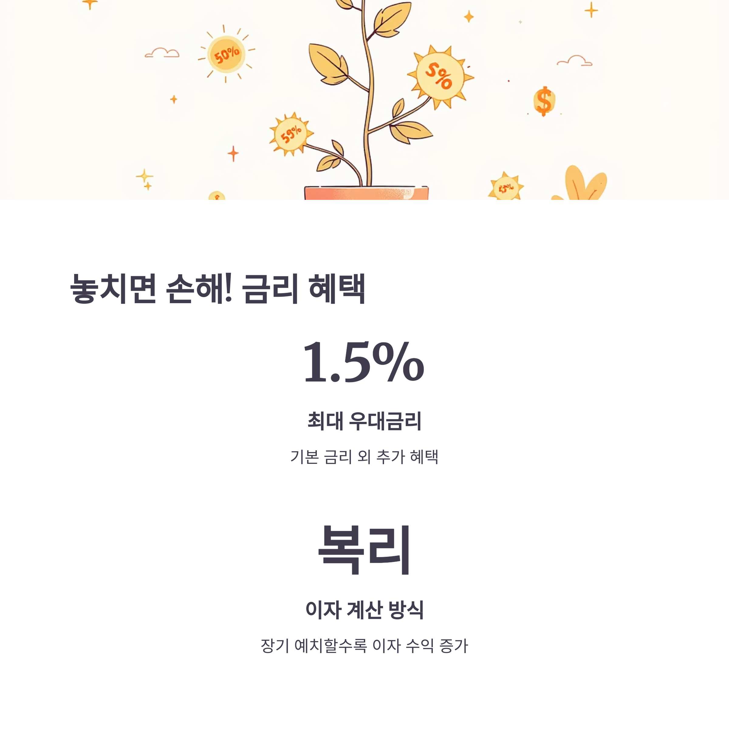기본 금리 외에도 최대 연 1.5%까지 우대 금리가 제공되며, 이자 계산 시 복리로 적용됩니다.