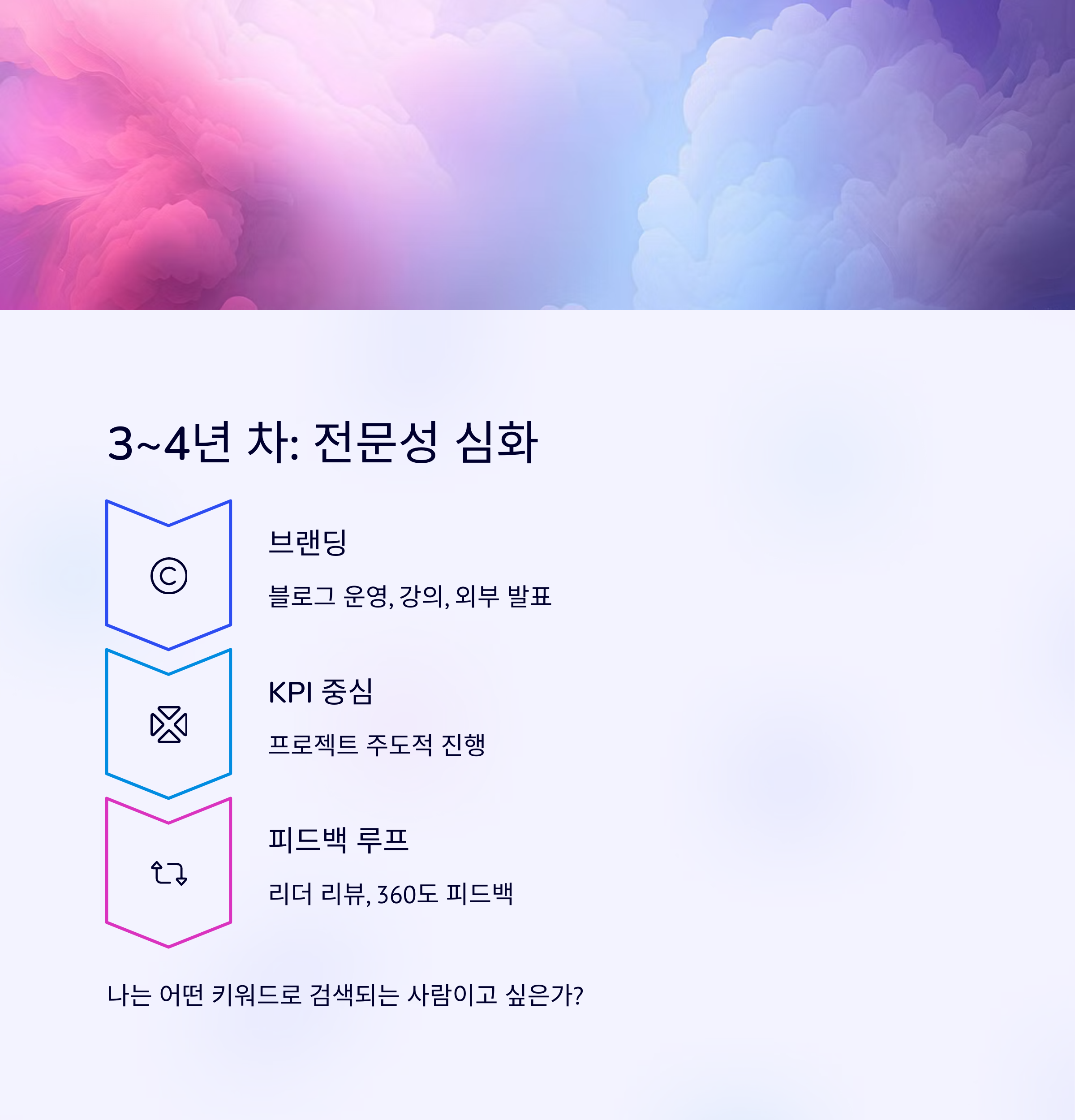 | 3~4년 전략 | 나만의 강점은 무엇이며, 어떤 브랜딩이 필요한가? |