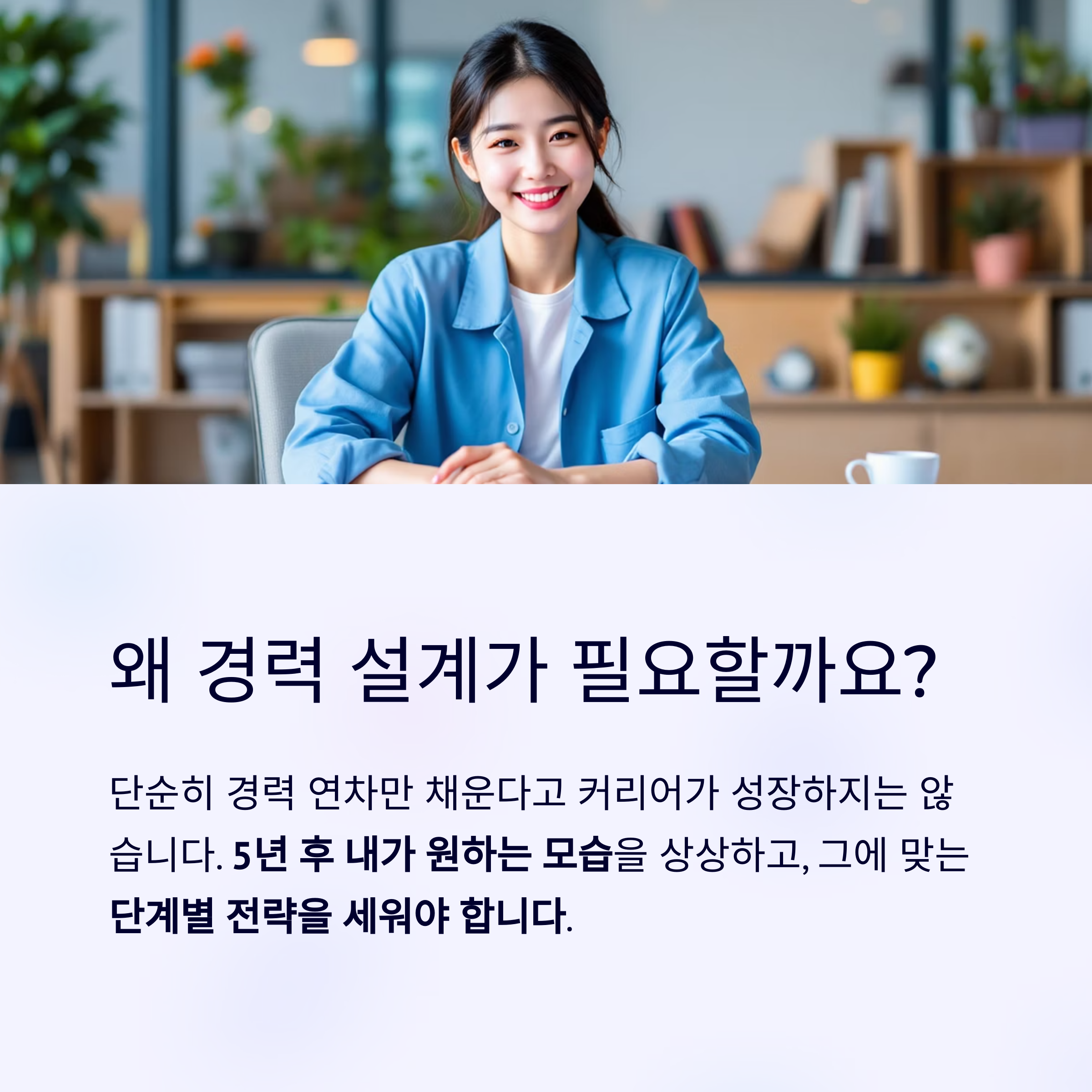 5년 후 내가 원하는 모습을 상상하고, 그에 맞는 단계별 전략을 세워야 합니다