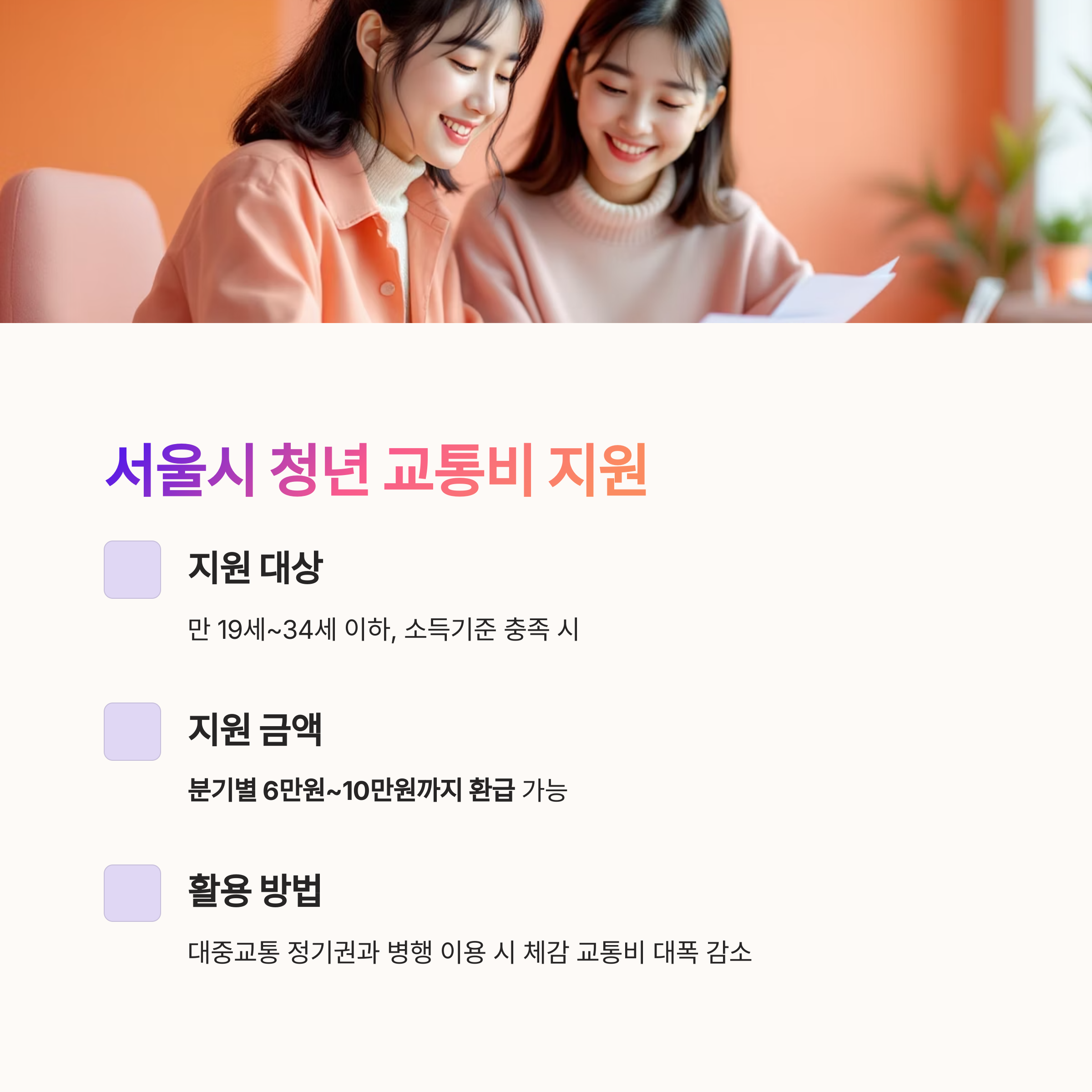 | 서울 청년 교통비 환급 | 만 19~34세 신혼부부 | 분기 최대 10만원 환급 | 서울시 복지포털 |