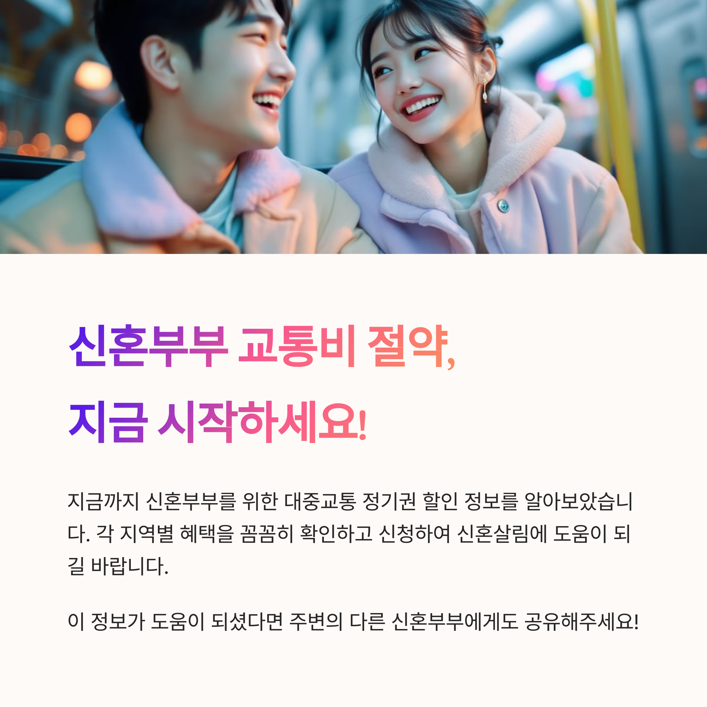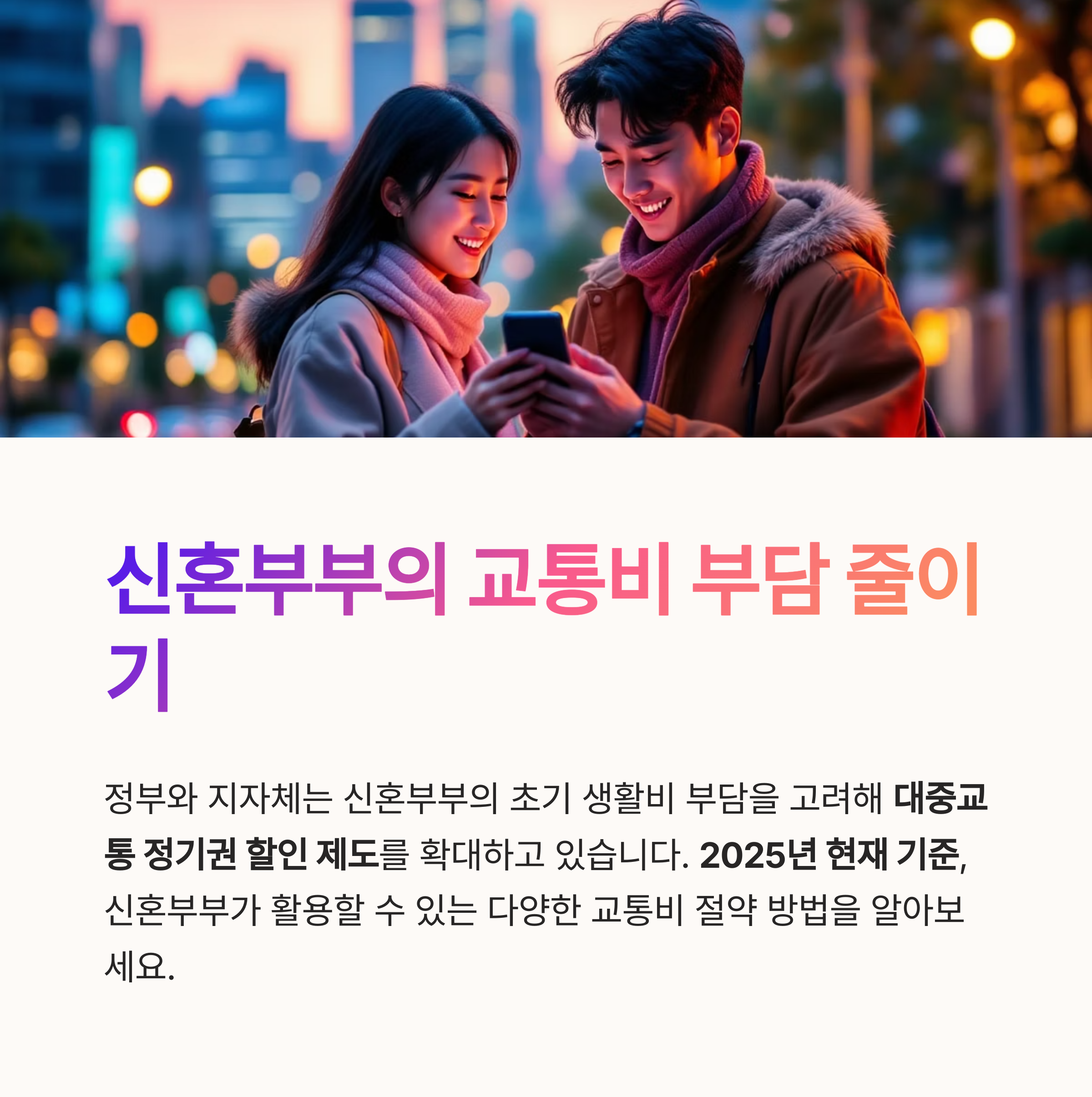 이 글에서는 2025년 현재 기준, 신혼부부가 이용할 수 있는 대중교통 할인 정책과