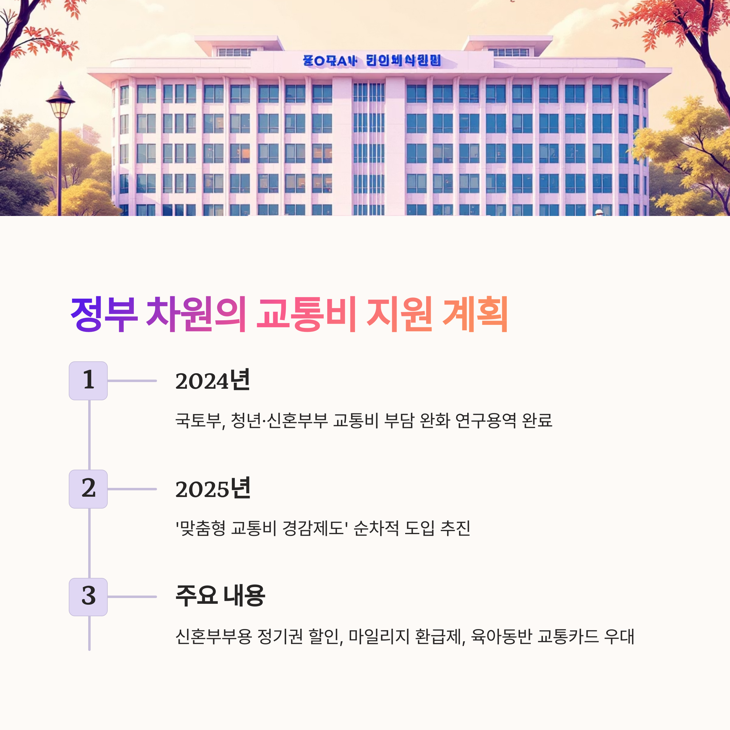 2024년 기준, 국토부는 청년·신혼부부 교통비 부담 완화를 위한 연구용역을 마쳤으며,