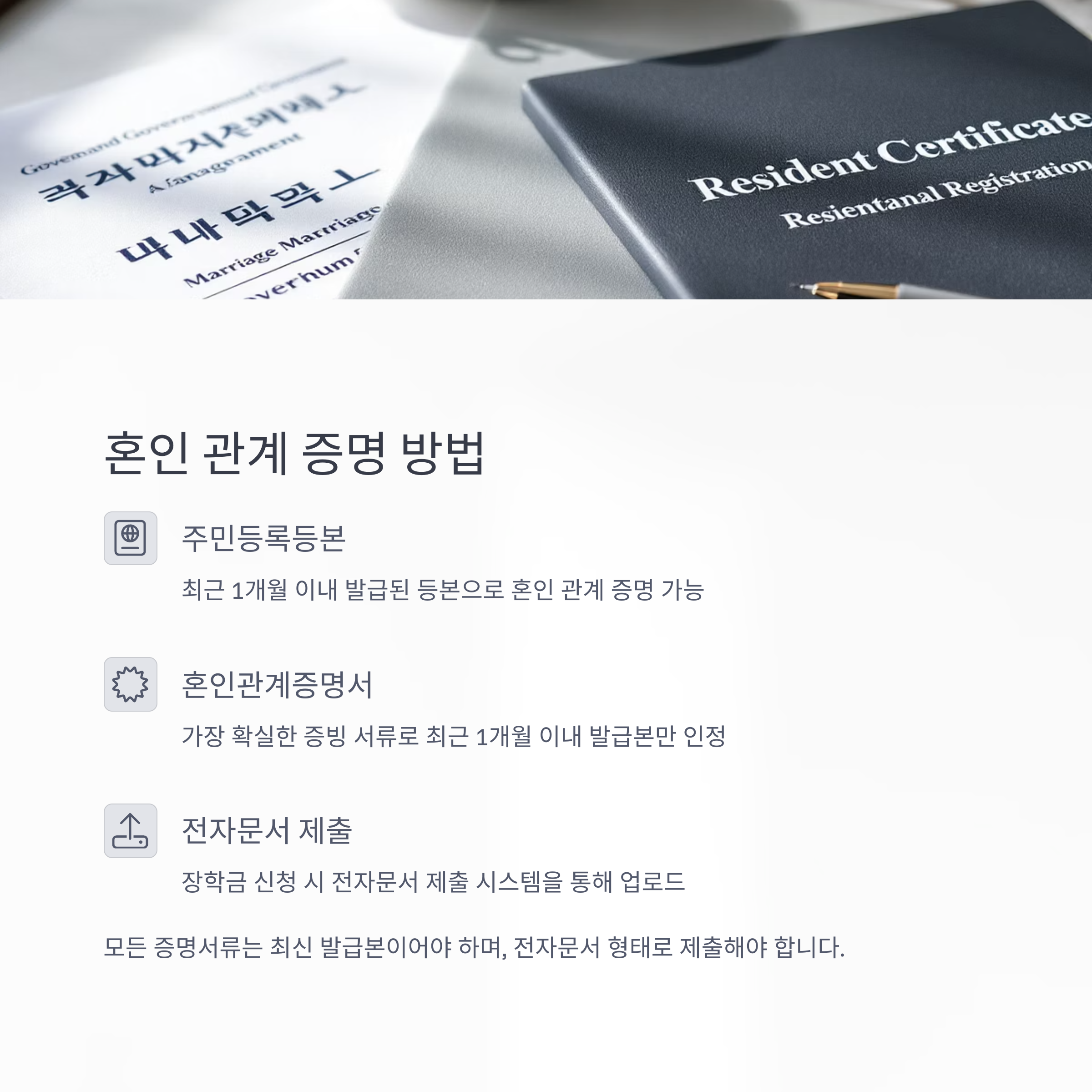 혼인 관계는 주민등록등본 혹은 혼인관계증명서로 증명해야 하며, 반드시 최근 1개월 이내 발급본이어야