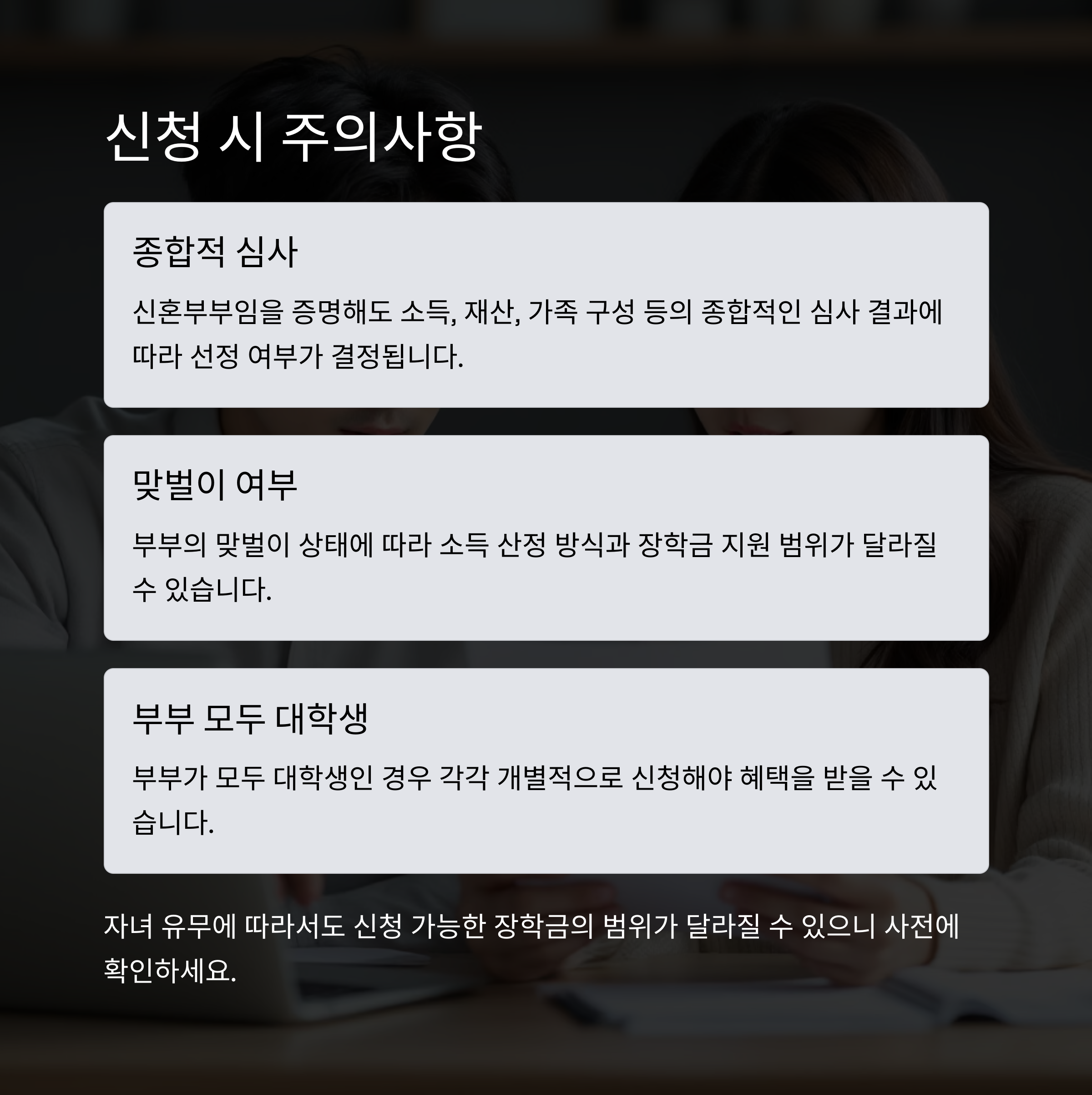 신혼부부의 경우 일반적인 국가장학금 외에도 신혼부부 특별지원 유형이나 맞춤형 복지장학금 등을 통해