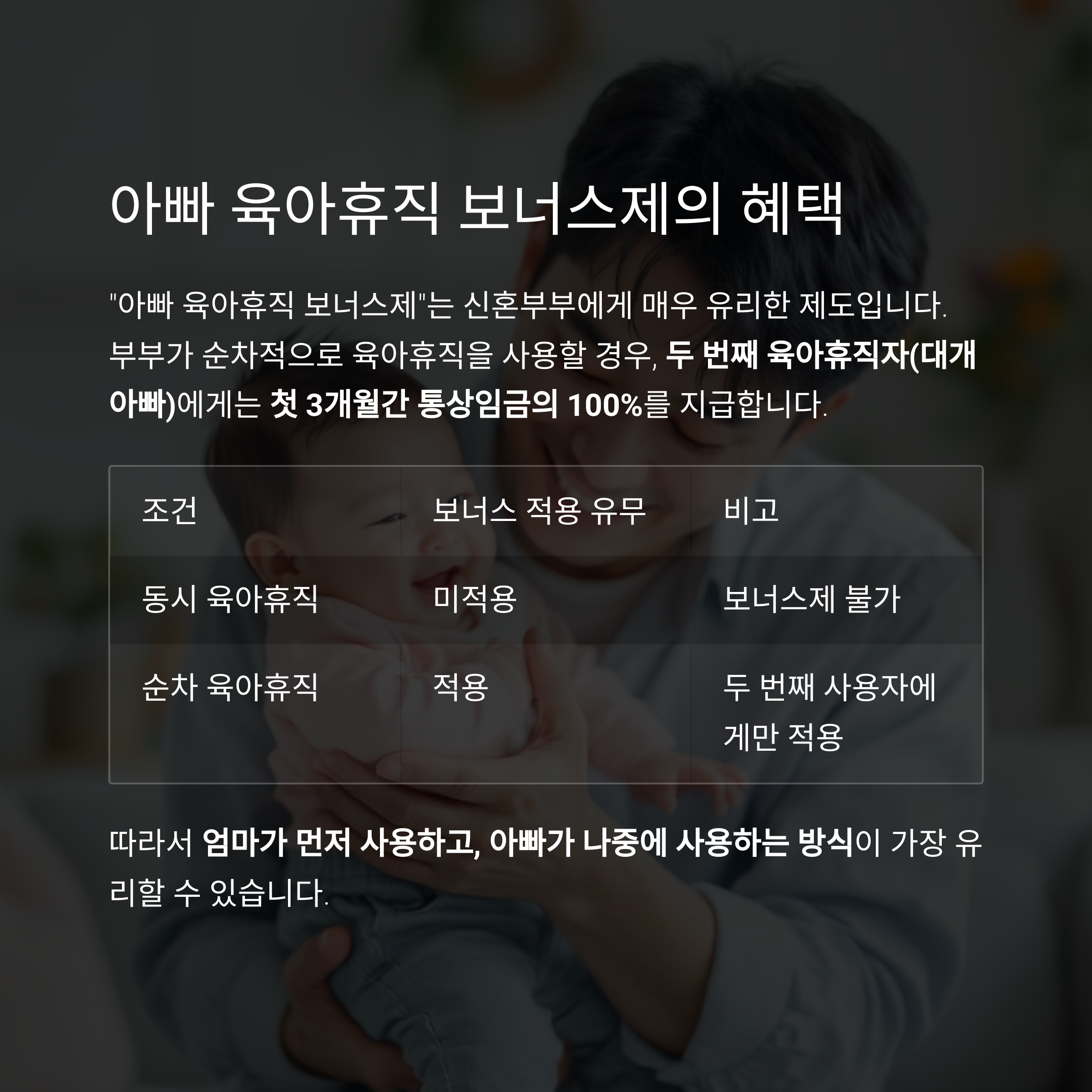 "아빠 육아휴직 보너스제"는 신혼부부에게 매우 유리한 제도입니다.