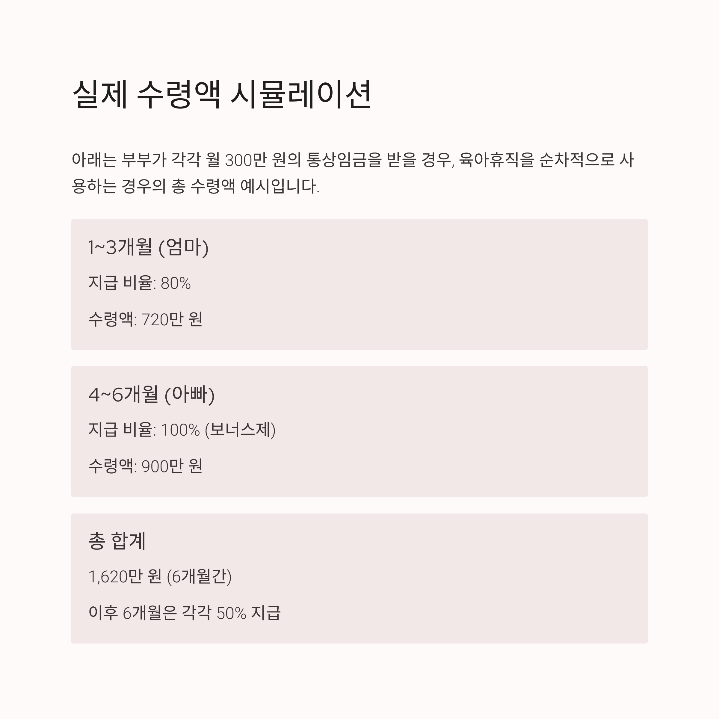 두 사람 모두 육아휴직을 사용하는 경우, 각자의 급여와 시기, 순서에 따라 수령액에 큰 차이가 발생할 수 있습니다.