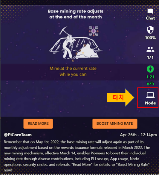 - Node 아이콘을 클릭하지 않으면 노드가 작동하지 않을 수 있음(핸드폰 번개 버튼은 24시간에 한 번씩 눌러 주는 건 필수)